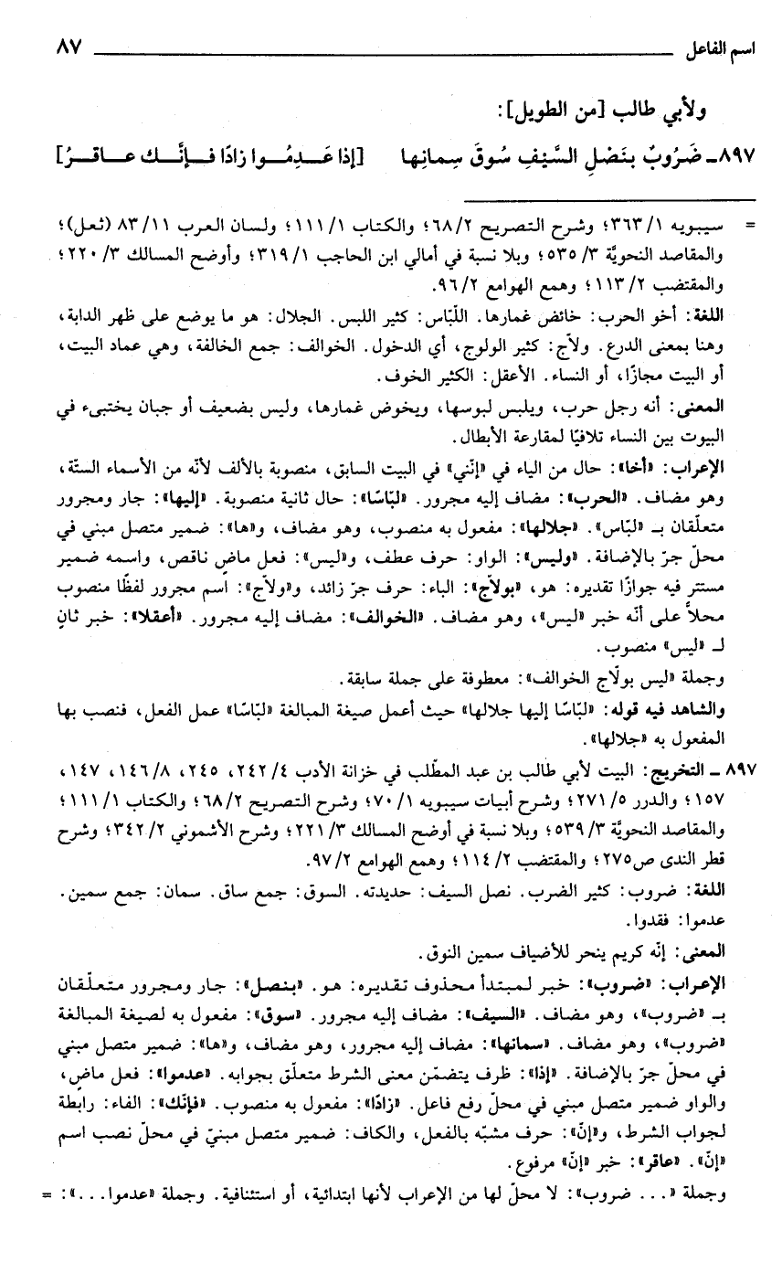 897 - التخريج: البيت لأبي طالب بن عبد المطلب في خزانة الأدب 4/ 242، 245، 8/ 146، 147، 157؛ والدرر 5/ 271؛ وشرح أبيات سيبويه 1/ 70؛ وشرح التصريح 2/ 68؛ والكتاب 1/ 111؛ والمقاصد النحويَّة 3/ 539؛ وبلا نسبة في أوضح المسالك 3/ 221؛ وشرح الأشموني 2/ 342؛ وشرح قطر الندى ص 275؛ والمقتضب 2/ 114؛ وهمع الهوامع 2/ 97.