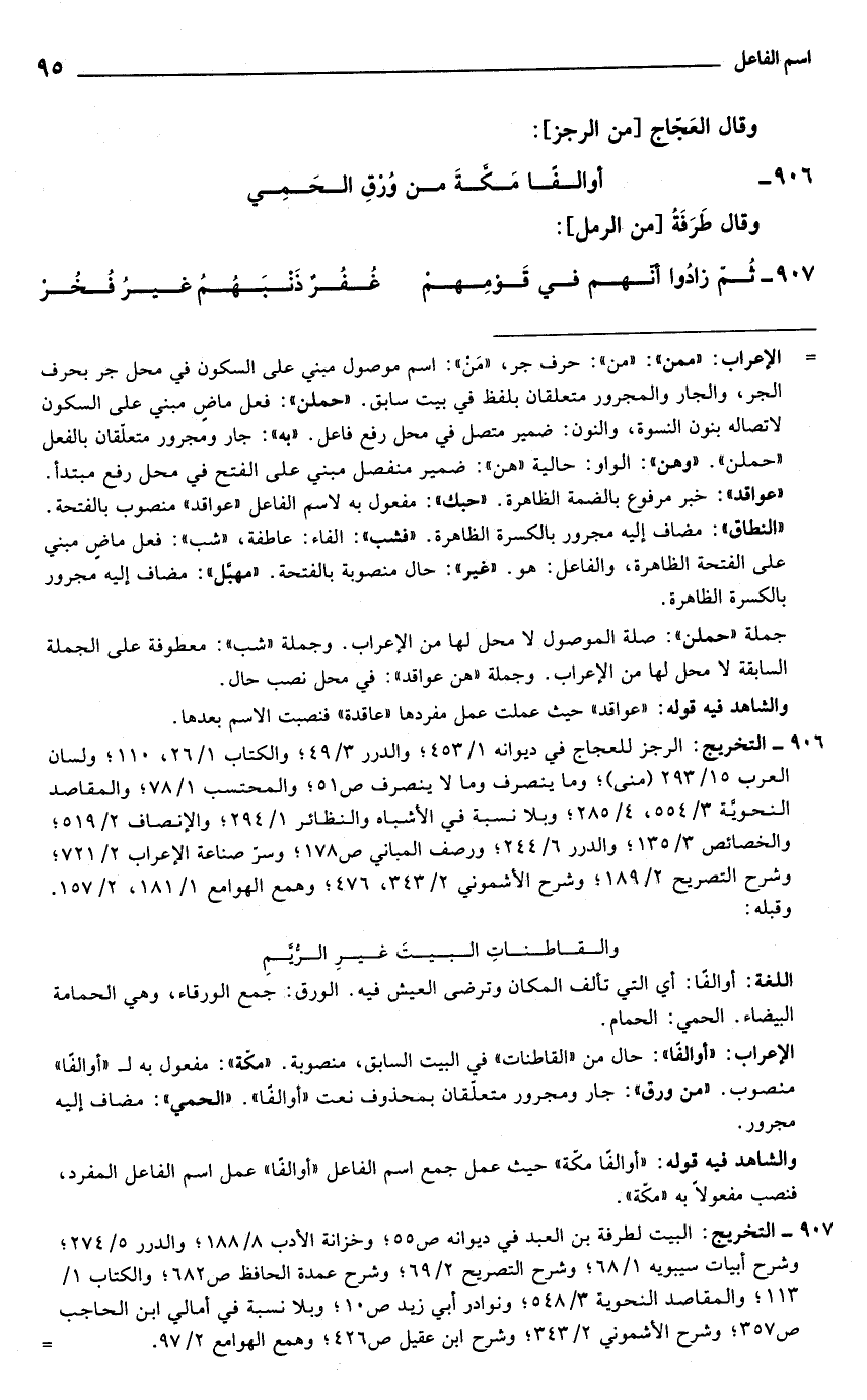 والشاهد فيه قوله: "أوالفًا مكة" حيث عمل جمع اسم الفاعل "أوالفًا" عمل اسم الفاعل المفرد، فنصب مفعولًا به "مكة".