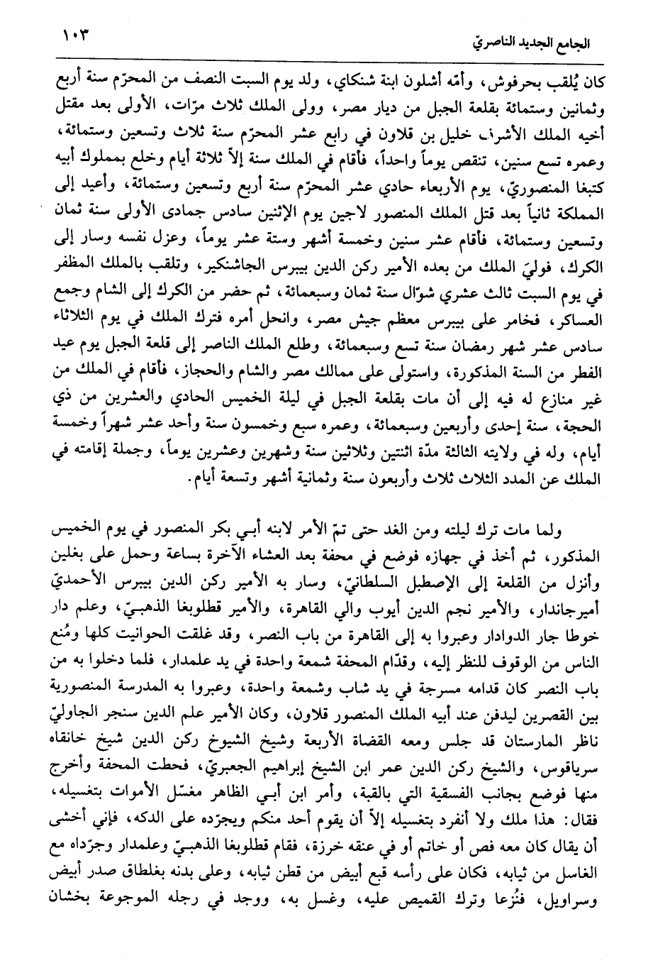ولما مات ترك ليلته ومن الغد حتى تمّ الأمر لابنه أبي بكر المنصور في يوم الخميس المذكور، ثم أخذ في جهازه فوضع في محفة بعد العشاء الآخرة بساعة وحمل على بغلين وأنزل من القلعة إلى الإصطبل السلطانيّ، وسار به الأمير ركن الدين بيبرس الأحمديّ أمير جاندار، والأمير نجم الدين أيوب والي القاهرة، والأمير قطلوبغا الذهبيّ، وعلم دار خوطا جار الدوادار وعبروا به إلى القاهرة من باب النصر، وقد غلقت الحوانيت كلها ومنع الناس من الوقوف للنظر إليه، وقدّام المحفة شمعة واحدة في يد علمدار، فلما دخلوا به من باب النصر كان قدامه مسرجة في يد شاب وشمعة واحدة، وعبروا به المدرسة المنصورية بين القصرين ليدفن عند أبيه الملك المنصور قلاون، وكان الأمير علم الدين سنجر الجاوليّ ناظر المارستان قد جلس ومعه القضاة الأربعة وشيخ الشيوخ ركن الدين شيخ خانقاه سرياقوس، والشيخ ركن الدين عمر ابن الشيخ إبراهيم الجعبريّ، فحطت المحفة وأخرج منها فوضع بجانب الفسقية التي بالقبة، وأمر ابن أبي الظاهر مغسّل الأموات بتغسيله، فقال: هذا ملك ولا أنفرد بتغسيله إلّا أن يقوم أحد منكم ويجرّده على الدكه، فإني أخشى أن يقال كان معه فص أو خاتم أو في عنقه خرزة، فقام قطلوبغا الذهبيّ وعلمدار وجرّداه مع الغاسل من ثيابه، فكان على رأسه قبع أبيض من قطن ثيابه، وعلى بدنه بغلطاق صدر أبيض وسراويل، فنزعا وترك القميص عليه، وغسل به، ووجد في رجله الموجوعة بخشان