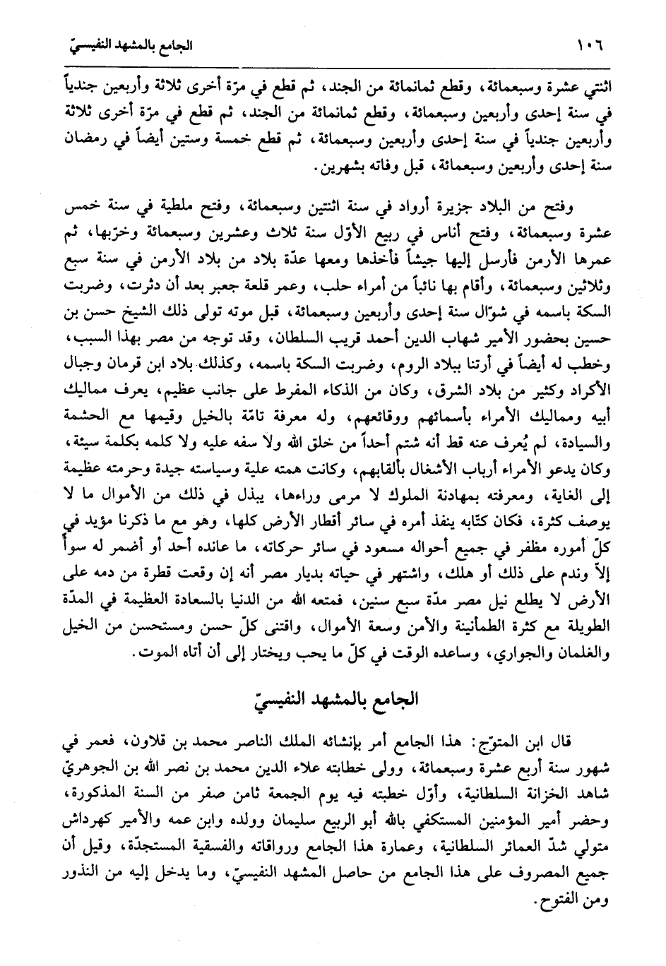 قال ابن المتوّج: هذا الجامع أمر بإنشائه الملك الناصر محمد بن قلاون، فعمر في شهور سنة أربع عشرة وسبعمائة، وولى خطابته علاء الدين محمد بن نصر الله بن الجوهريّ شاهد الخزانة السلطانية، وأوّل خطبته فيه يوم الجمعة ثامن صفر من السنة المذكورة، وحضر أمير المؤمنين المستكفي بالله أبو الربيع سليمان وولده وابن عمه والأمير كهرداش متولي شدّ العمائر السلطانية، وعمارة هذا الجامع ورواقاته والفسقية المستجدّة، وقيل أن جميع المصروف على هذا الجامع من حاصل المشهد النفيسيّ، وما يدخل إليه من النذور ومن الفتوح.