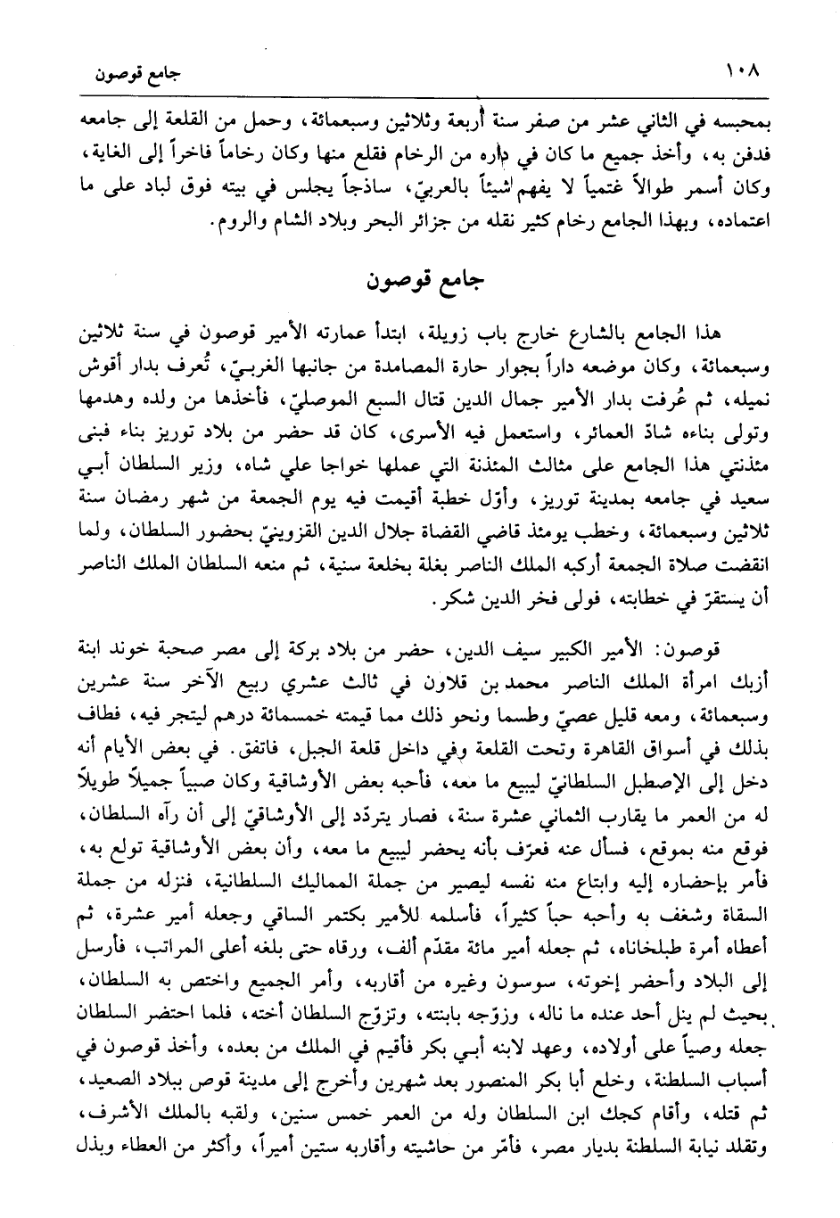 قوصون: الأمير الكبير سيف الدين، حضر من بلاد بركة إلى مصر صحبة خوند ابنة أزبك امرأة الملك الناصر محمد بن قلاون في ثالث عشري ربيع الآخر سنة عشرين وسبعمائة، ومعه قليل عصيّ وطسما ونحو ذلك مما قيمته خمسمائة درهم ليتجر فيه، فطاف بذلك في أسواق القاهرة وتحت القلعة وفي داخل قلعة الجبل، فاتفق. في بعض الأيام أنه دخل إلى الإصطبل السلطانيّ ليبيع ما معه، فأحبه بعض الأوشاقية وكان صبيا جميلا طويلا له من العمر ما يقارب الثماني عشرة سنة، فصار يتردّد إلى الأوشاقيّ إلى أن رآه السلطان، فوقع منه بموقع، فسأل عنه فعرّف بأنه يحضر ليبيع ما معه، وأن بعض الأوشاقية تولع به، فأمر بإحضاره إليه وابتاع منه نفسه ليصير من جملة المماليك السلطانية، فنزله من جملة السقاة وشغف به وأحبه حبا كثيرا، فأسلمه للأمير بكتمر الساقي وجعله أمير عشرة، ثم أعطاه أمرة طبلخاناه، ثم جعله أمير مائة مقدّم ألف، ورقاه حتى بلغه أعلى المراتب، فأرسل إلى البلاد وأحضر إخوته، سوسون وغيره من أقاربه، وأمر الجميع واختص به السلطان، بحيث لم ينل أحد عنده ما ناله، وزوّجه بابنته، وتزوّج السلطان أخته، فلما احتضر السلطان جعله وصيا على أولاده، وعهد لابنه أبي بكر فأقيم في الملك من بعده، وأخذ قوصون في أسباب السلطنة، وخلع أبا بكر المنصور بعد شهرين وأخرج إلى مدينة قوص ببلاد الصعيد، ثم قتله، وأقام كجك ابن السلطان وله من العمر خمس سنين، ولقبه بالملك الأشرف، وتقلد نيابة السلطنة بديار مصر، فأمّر من حاشيته وأقاربه ستين أميرا، وأكثر من العطاء وبذل