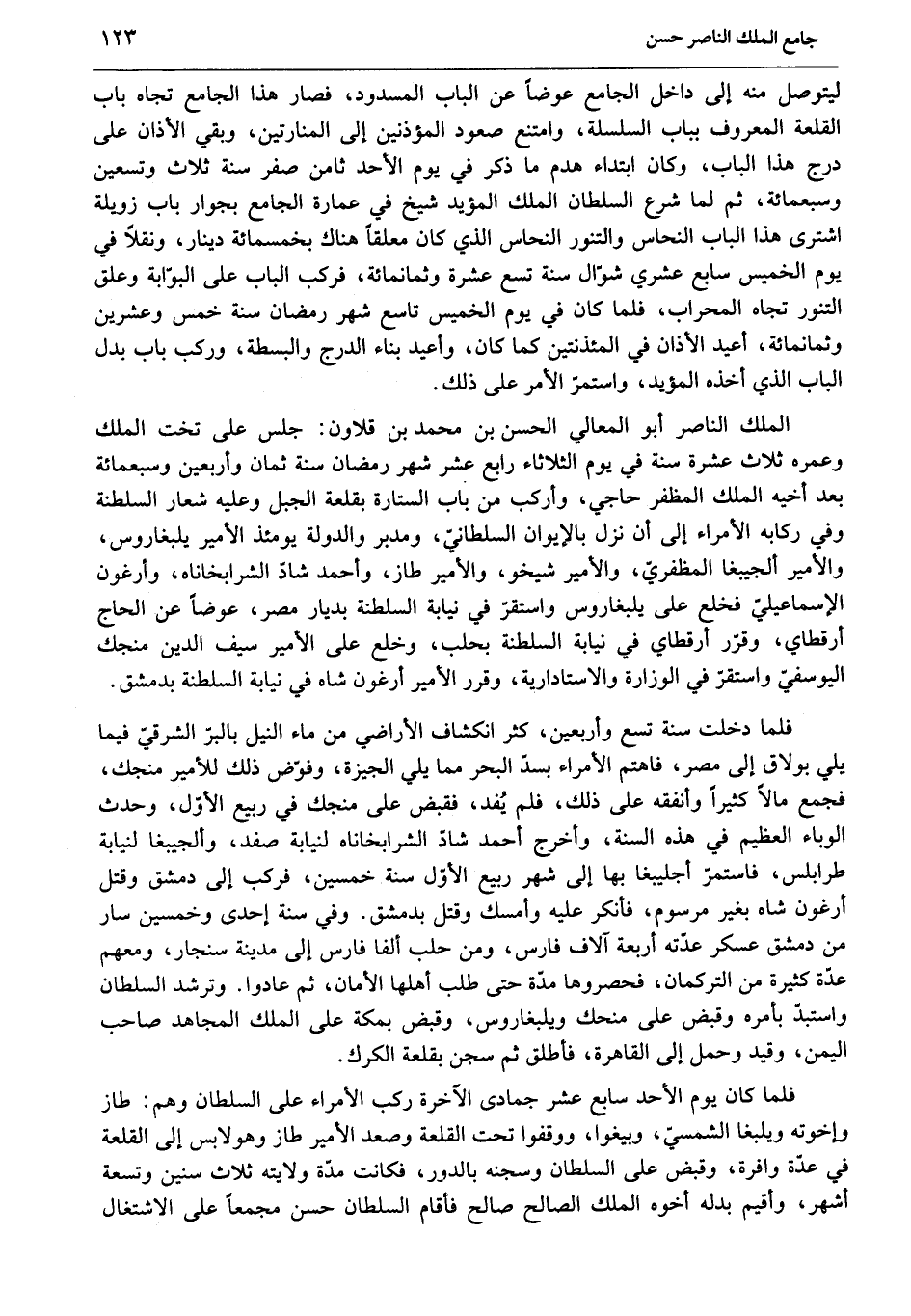 فلما دخلت سنة تسع وأربعين، كثر انكشاف الأراضي من ماء النيل بالبرّ الشرقيّ فيما يلي بولاق إلى مصر، فاهتم الأمراء بسدّ البحر مما يلي الجيزة، وفوّض ذلك للأمير منجك، فجمع مالا كثيرا وأنفقه على ذلك، فلم يفد، فقبض على منجك في ربيع الأوّل، وحدث الوباء العظيم في هذه السنة، وأخرج أحمد شادّ الشرابخاناه لنيابة صفد، وألجيبغا لنيابة طرابلس، فاستمرّ أجليبغا بها إلى شهر ربيع الأوّل سنة خمسين، فركب إلى دمشق وقتل أرغون شاه بغير مرسوم، فأنكر عليه وأمسك وقتل بدمشق. وفي سنة إحدى وخمسين سار من دمشق عسكر عدّته أربعة آلاف فارس، ومن حلب ألفا فارس إلى مدينة سنجار، ومعهم عدّة كثيرة من التركمان، فحصروها مدّة حتى طلب أهلها الأمان، ثم عادوا. وترشد السلطان واستبدّ بأمره وقبض على منحك ويلبغاروس، وقبض بمكة على الملك المجاهد صاحب اليمن، وقيد وحمل إلى القاهرة، فأطلق ثم سجن بقلعة الكرك.