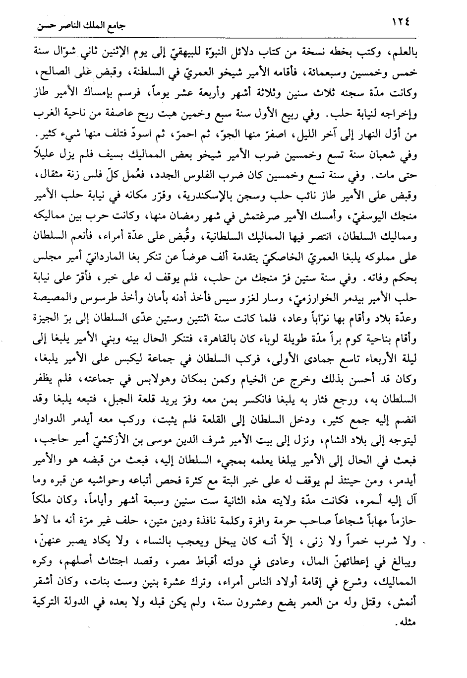 بالعلم، وكتب بخطه نسخة من كتاب دلائل النبوّة للبيهقيّ إلى يوم الاثنين ثاني شوّال سنة خمس وخمسين وسبعمائة، فأقامه الأمير شيخو العمريّ في السلطنة، وقبض على الصالح، وكانت مدّة سجنه ثلاث سنين وثلاثة أشهر وأربعة عشر يوما، فرسم بإمساك الأمير طاز وإخراجه لنيابة حلب. وفي ربيع الأول سنة سبع وخمين هبت ريح عاصفة من ناحية الغرب من أوّل النهار إلى آخر الليل، اصفرّ منها الجوّ، ثم احمرّ، ثم اسودّ فتلف منها شيء كثير.