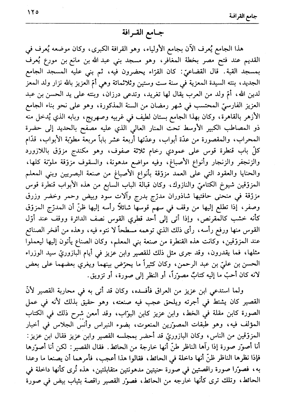 هذا الجامع يعرف الآن بجامع الأولياء، وهو القرافة الكبرى، وكان موضعه يعرف في القديم عند فتح مصر بخطة المغافر، وهو مسجد بني عبد الله بن مانع بن مورع يعرف بمسجد القبة. قال القضاعيّ: كان القرّاء يحضرون فيه، ثم بني عليه المسجد الجامع الجديد، بنته السيدة المعزية في سنة ست وستين وثلاثمائة وهي أمّ العزيز بالله نزار ولد المعز لدين الله، أمّ ولد من العرب يقال لها تغريد، وتدعى درزان، وبنته على يد الحسن بن عبد العزيز الفارسيّ المحتسب في شهر رمضان من السنة المذكورة، وهو على نحو بناء الجامع الأزهر بالقاهرة، وكان بهذا الجامع بستان لطيف في غربيه وصهريج، وبابه الذي يدخل منه ذو المصاطب الكبير الأوسط تحت المنار العالي الذي عليه مصفح بالحديد إلى حضرة المحراب، والمقصورة من عدّة أبواب، وعدّتها أربعة عشر بابا مربعة مطوّبة الأبواب، قدّام كلّ باب قنطرة قوس على عمودي رخام ثلاثة صفوف، وهو مكندج مزوّق باللازورد والزنجفر والزنجار وأنواع الأصباغ، وفيه مواضع مدهونة، والسقوف مزوّقة ملوّنة كلها، والحنايا والعقود التي على العمد مزوّقة بأنواع الأصباغ من صنعة البصريين وبني المعلم المزوّقين شيوخ الكتاميّ والنازوك، وكان قبالة الباب السابع من هذه الأبواب قنطرة قوس مزوّقة في منحنى حافتيها شاذوران مدرّج بدرج وآلات سود وبيض وحمر وخضر وزرق وصفر، إذا تطلع إليها من وقف في سهم قوسها شائلا رأسه إليها ظنّ أن المدرّج المزوّق كأنه خشب كالمقرنص، وإذا أتى إلى أحد قطري القوس نصف الدائرة ووقف عند أوّل القوس منها ورفع رأسه، رأى ذلك الذي توهمه مسطحا لا نتوء فيه، وهذه من أفخر الصنائع عند المزوّقين، وكانت هذه القنطرة من صنعة بني المعلم، وكان الصناع يأتون إليها ليعملوا مثلها، فما يقدرون، وقد جرى مثل ذلك للقصير وابن عزيز في أيام البازوريّ سيد الوزراء الحسن بن عليّ بن عبد الرحمن، وكان كثيرا ما يحرّض بينهما ويغري بعضهما على بعض لانه كان أحبّ ما إليه كتاب مصوّرا، أو النظر إلى صورة، أو تزويق.