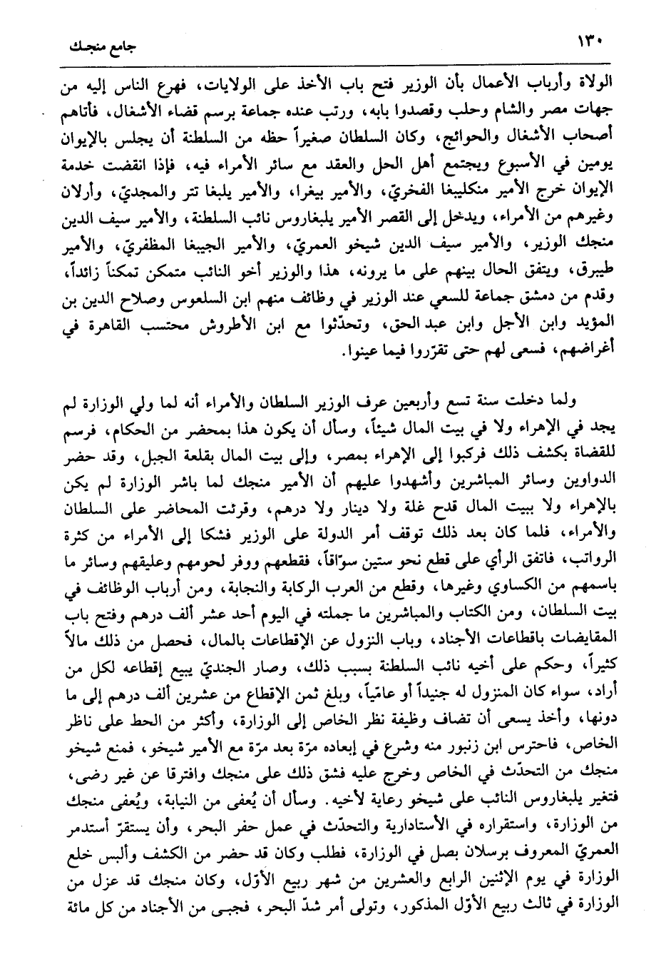 ولما دخلت سنة تسع وأربعين عرف الوزير السلطان والأمراء أنه لما ولي الوزارة لم يجد في الإهراء ولا في بيت المال شيئا، وسأل أن يكون هذا بمحضر من الحكام، فرسم للقضاة بكشف ذلك فركبوا إلى الإهراء بمصر، وإلى بيت المال بقلعة الجبل، وقد حضر الدواوين وسائر المباشرين وأشهدوا عليهم أن الأمير منجك لما باشر الوزارة لم يكن بالإهراء ولا ببيت المال قدح غلة ولا دينار ولا درهم، وقرئت المحاضر على السلطان والأمراء، فلما كان بعد ذلك توقف أمر الدولة على الوزير فشكا إلى الأمراء من كثرة الرواتب، فاتفق الرأي على قطع نحو ستين سوّاقا، فقطعهم ووفر لحومهم وعليقهم وسائر ما باسمهم من الكساوي وغيرها، وقطع من العرب الركابة والنجابة، ومن أرباب الوظائف في بيت السلطان، ومن الكتاب والمباشرين ما جملته في اليوم أحد عشر ألف درهم وفتح باب المقايضات باقطاعات الأجناد، وباب النزول عن الإقطاعات بالمال، فحصل من ذلك مالا كثيرا، وحكم على أخيه نائب السلطنة بسبب ذلك، وصار الجنديّ يبيع إقطاعه لكل من أراد، سواء كان المنزول له جنيدا أو عامّيا، وبلغ ثمن الإقطاع من عشرين ألف درهم إلى ما دونها. وأخذ يسعى أن تضاف وظيفة نظر الخاص إلى الوزارة، وأكثر من الحط على ناظر الخاص، فاحترس ابن زنبور منه وشرع في إبعاده مرّة بعد مرّة مع الأمير شيخو، فمنع شيخو منجك من التحدّث في الخاص وخرج عليه فشق ذلك على منجك وافترقا عن غير رضى، فتغير يلبغاروس النائب على شيخو رعاية لأخيه. وسأل أن يعفى من النيابة، ويعفى منجك من الوزارة، واستقراره في الأستادارية والتحدّث في عمل حفر البحر، وأن يستقرّ أستدمر العمريّ المعروف برسلان بصل في الوزارة، فطلب وكان قد حضر من الكشف وألبس خلع الوزارة في يوم الاثنين الرابع والعشرين من شهر ربيع الأوّل، وكان منجك قد عزل من الوزارة في ثالث ربيع الأوّل المذكور، وتولى أمر شدّ البحر، فجبى من الأجناد من كل مائة