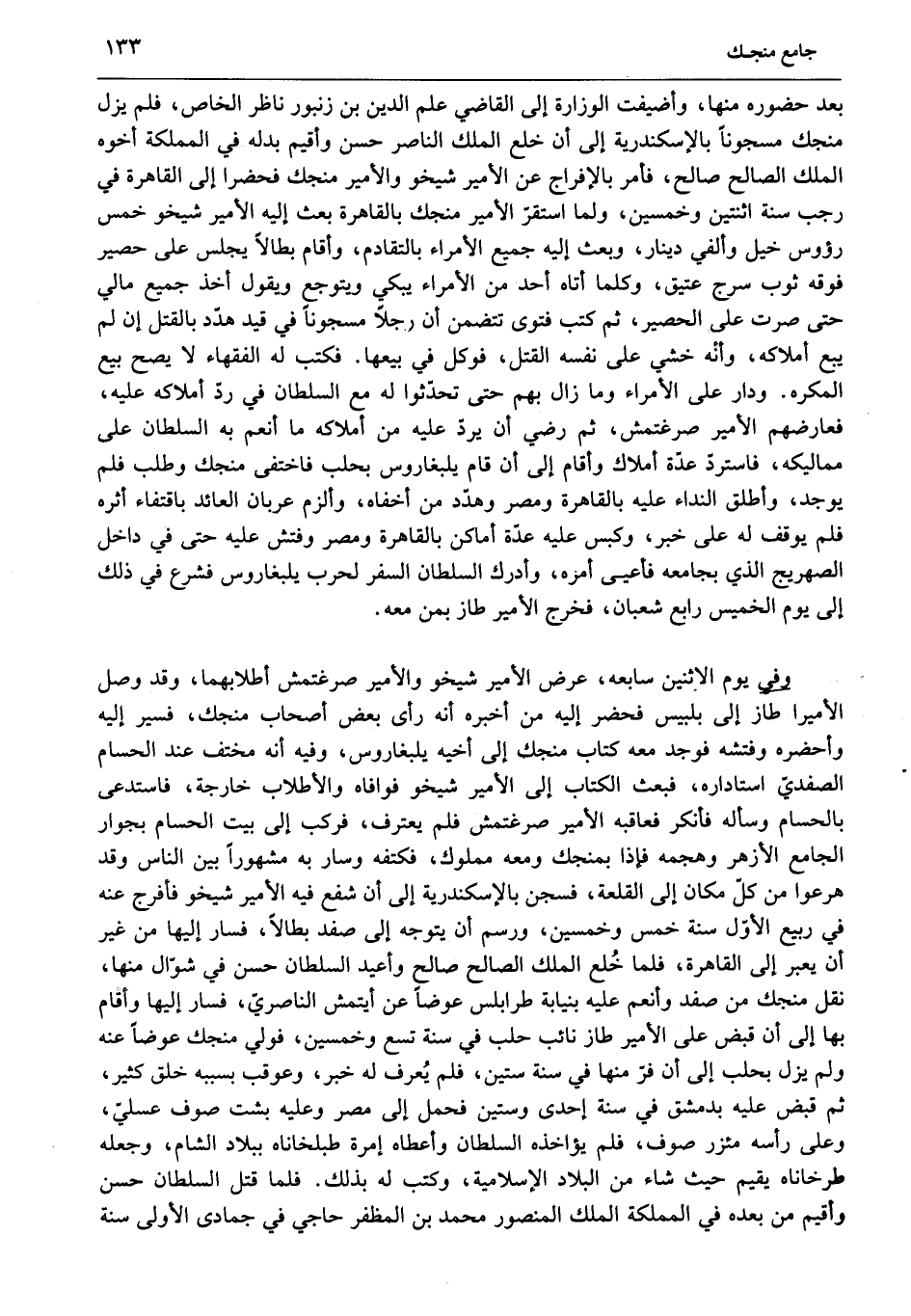 وفي يوم الاثنين سابعه، عرض الأمير شيخو والأمير صرغتمش أطلابهما، وقد وصل الأميرا طاز إلى بلبيس فحضر إليه من أخبره أنه رأى بعض أصحاب منجك، فسير إليه وأحضره وفتشه فوجد معه كتاب منجك إلى أخيه يلبغاروس، وفيه أنه مختف عند الحسام الصفديّ استاداره، فبعث الكتاب إلى الأمير شيخو فوافاه والأطلاب خارجة، فاستدعى بالحسام وسأله فأنكر فعاقبه الأمير صرغتمش فلم يعترف، فركب إلى بيت الحسام بجوار الجامع الأزهر وهجمه فإذا بمنجك ومعه مملوك، فكتفه وسار به مشهورا بين الناس وقد هرعوا من كلّ مكان إلى القلعة، فسجن بالإسكندرية إلى أن شفع فيه الأمير شيخو فأفرج عنه في ربيع الأوّل سنة خمس وخمسين، ورسم أن يتوجه إلى صفد بطالا، فسار إليها من غير أن يعبر إلى القاهرة، فلما خلع الملك الصالح صالح وأعيد السلطان حسن في شوّال منها، نقل منجك من صفد وأنعم عليه بنيابة طرابلس عوضا عن أيتمش الناصريّ، فسار إليها وأقام بها إلى أن قبض على الأمير طاز نائب حلب في سنة تسع وخمسين، فولي منجك عوضا عنه ولم يزل بحلب إلى أن فرّ منها في سنة ستين، فلم يعرف له خبر، وعوقب بسببه خلق كثير، ثم قبض عليه بدمشق في سنة إحدى وستين فحمل إلى مصر وعليه بشت صوف عسليّ، وعلى رأسه مئزر صوف، فلم يؤاخذه السلطان وأعطاه إمرة طبلخاناه ببلاد الشام، وجعله طرخاناه يقيم حيث شاء من البلاد الإسلامية، وكتب له بذلك. فلما قتل السلطان حسن وأقيم من بعده في المملكة الملك المنصور محمد بن المظفر حاجي في جمادى الأولى سنة