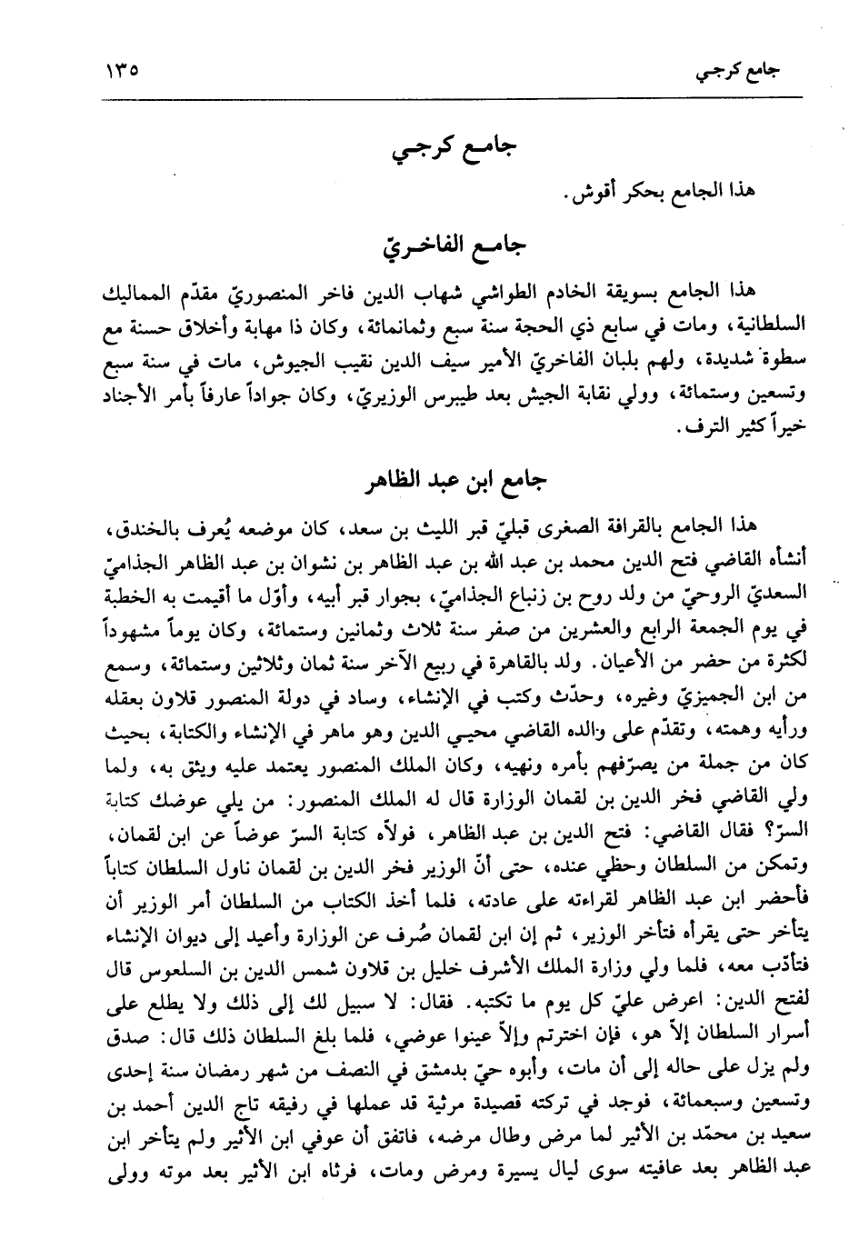هذا الجامع بالقرافة الصغرى قبليّ قبر الليث بن سعد، كان موضعه يعرف بالخندق، أنشأه القاضي فتح الدين محمد بن عبد الله بن عبد الظاهر بن نشوان بن عبد الظاهر الجذاميّ السعديّ الروحيّ من ولد روح بن زنباع الجذاميّ، بجوار قبر أبيه، وأوّل ما أقيمت به الخطبة في يوم الجمعة الرابع والعشرين من صفر سنة ثلاث وثمانين وستمائة، وكان يوما مشهودا لكثرة من حضر من الأعيان. ولد بالقاهرة في ربيع الآخر سنة ثمان وثلاثين وستمائة، وسمع من ابن الجميزيّ وغيره، وحدّث وكتب في الإنشاء، وساد في دولة المنصور قلاون بعقله ورأيه وهمته، وتقدّم على والده القاضي محيي الدين وهو ماهر في الإنشاء والكتابة، بحيث كان من جملة من يصرّفهم بأمره ونهيه، وكان الملك المنصور يعتمد عليه ويثق به، ولما ولي القاضي فخر الدين بن لقمان الوزارة قال له الملك المنصور: من يلي عوضك كتابة السرّ؟ فقال القاضي: فتح الدين بن عبد الظاهر، فولّاه كتابة السرّ عوضا عن ابن لقمان، وتمكن من السلطان وحظي عنده، حتى أنّ الوزير فخر الدين بن لقمان ناول السلطان كتابا فأحضر ابن عبد الظاهر لقراءته على عادته، فلما أخذ الكتاب من السلطان أمر الوزير أن يتأخر حتى يقرأه فتأخر الوزير، ثم إن ابن لقمان صرف عن الوزارة وأعيد إلى ديوان الإنشاء فتأدّب معه، فلما ولي وزارة الملك الأشرف خليل بن قلاون شمس الدين بن السلعوس قال لفتح الدين: اعرض عليّ كل يوم ما تكتبه. فقال: لا سبيل لك إلى ذلك ولا يطلع على أسرار السلطان إلّا هو، فإن اخترتم وإلّا عينوا عوضي، فلما بلغ السلطان ذلك قال: صدق ولم يزل على حاله إلى أن مات، وأبوه حيّ بدمشق في النصف من شهر رمضان سنة إحدى وتسعين وسبعمائة، فوجد في تركته قصيدة مرثية قد عملها في رفيقه تاج الدين أحمد بن سعيد بن محمّد بن الأثير لما مرض وطال مرضه، فاتفق أن عوفي ابن الأثير ولم يتأخر ابن عبد الظاهر بعد عافيته سوى ليال يسيرة ومرض ومات، فرثاه ابن الأثير بعد موته وولى