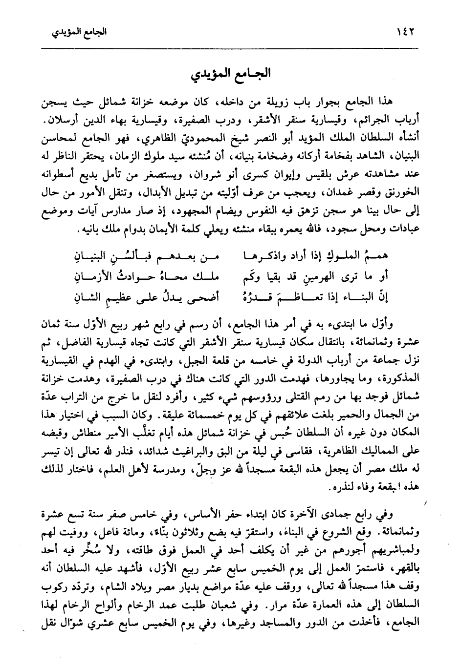 أنشأه السلطان الملك المؤيد أبو النصر شيخ المحموديّ الظاهري، فهو الجامع لمحاسن البنيان، الشاهد بفخامة أركانه وضخامة بنيانه، أن منشئه سيد ملوك الزمان، يحتقر الناظر له عند مشاهدته عرش بلقيس وإيوان كسرى أنو شروان، ويستصغر من تأمل بديع أسطوانه الخورنق وقصر غمدان، ويعجب من عرف أوّليته من تبديل الأبدال، وتنقل الأمور من حال إلى حال بينا هو سجن تزهق فيه النفوس ويضام المجهود، إذ صار مدارس آيات وموضع عبادات ومحل سجود، فالله يعمره ببقاء منشئه ويعلي كلمة الأيمان بدوام ملك بانيه.