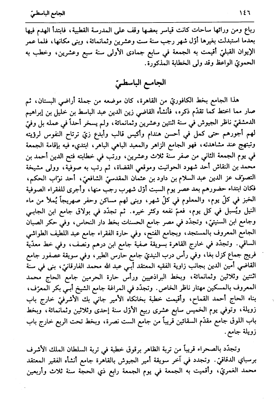 هذا الجامع بخط الكافوريّ من القاهرة، كان موضعه من جملة أراضي البستان، ثم صار مما اختط كما تقدّم ذكره، فأنشأه القاضي زين الدين عبد الباسط بن خليل بن إبراهيم الدمشقيّ ناظر الجيوش في سنة اثنتين وعشرين وثمانمائة، ولم يسخر أحدا في عمله بل وفيّ لهم أجورهم حتى كمل في أحسن هندام وأكيس قالب وأبدع زيّ ترتاح النفوس لرؤيته وتبتهج عند مشاهدته، فهو الجامع الزاهر والمعبد الباهي الباهر، ابتدئ فيه بإقامة الجمعة في يوم الجمعة الثاني من صفر سنة ثلاث وعشرين، ورتب في خطابته فتح الدين أحمد بن محمد بن النقاش أحد شهود الحوانيت وموقعي القضاة، ثم رتب به صوفية، وولى مشيخة التصوّف عز الدين عبد السلام بن داود بن عثمان المقدسيّ الشافعيّ، أحد نوّاب الحكم، فكان ابتداء حضورهم بعد عصر يوم السبت أوّل شهر رجب منها، وأجرى للفقراء الصوفية الخبز في كلّ يوم، والمعلوم في كلّ شهر، وبنى لهم مساكن وحفر صهريجا يملأ من ماء النيل ويسبل في كل يوم، فعمّ نفعه وكثر خيره. ثم تجدّد في بولاق جامع ابن الجابي وجامع ابن السنيتيّ، وتجدّد في مصر جامع الحسنات بخط دار النحاس، وفي حكر الصبان الجامع المعروف بالمستجد، وبجامع الفتح، وفي حارة الفقراء جامع عبد اللطيف الطواشيّ الساقي. وتجدّد في خارج القاهرة بسويقة صفية جامع ابن درهم ونصف، وفي خط معدّية فريج جماع كزل بغا، وفي رأس درب النيديّ جامع حارس الطير، وفي سويقة عصفور جامع القاضي أمين الدين بجانب زاوية الفقيه المعتقد أبي عبد الله محمد الفارقانيّ، بنى في سنة اثنتين وثلاثين وثمانمائة، وبخط البراذعيين ورأس حارة الحرمين جامع الحاج محمد المعروف بالمسكين مهتار ناظر الخاص. وتجدّد في المراغة جامع الشيخ أبي بكر المعرّف، بناه الحاج أحمد القماح، وأقيمت خطبة بخانكاه الأمير جاني بك الأشرفيّ خارج باب زويلة، وتوفي يوم الخميس سابع عشرى ربيع الأوّل سنة إحدى وثلاثين وثمانمائة، وبخط باب اللوق جامع مقدّم السقائين قريبا من جامع الست نصرة، وبخط تحت الربع خارج باب زويلة جامع.