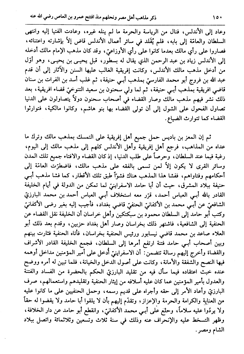 ثم إن المعز بن باديس حمل جميع أهل إفريقية على التمسك بمذهب مالك وترك ما عداه من المذاهب، فرجع أهل إفريقية وأهل الأندلس كلهم إلى مذهب مالك إلى اليوم، رغبة فيما عند السلطان، وحرصا على طلب الدنيا، إذ كان القضاء والافتاء جميع تلك المدن وسائر القرى لا يكون إلّا لمن تسمى بالفقه على مذهب مالك، فاضطرّت العامّة إلى أحكامهم وفتاواهم، ففشا هذا المذهب هناك فشوّا طبق تلك الأقطار، كما فشا مذهب أبي حنيفة ببلاد المشرق، حيث أن أبا حامد الاسفراينيّ لما تمكن من الدولة في أيام الخليفة القادر بالله أبي العباس أحمد، قرّر معه استخلاف أبي العباس أحمد بن محمد البارزيّ الشافعيّ عن أبي محمد بن الأكفانيّ الحنفيّ قاضي بغداد، فأجيب إليه بغير رضى الأكفانيّ وكتب أبو حامد إلى السلطان محمود بن سبكتكين وأهل خراسان أن الخليفة نقل القضاء عن الحنفية إلى الشافعية، فاشتهر ذلك بخراسان وصار أهل بغداد حزبين، وقدم بعد ذلك أبو العلاء صاعد بن محمد قاضي نيسابور ورئيس الحنفية بخراسان، فأتاه الحنفية فثارت بينهم وبين أصحاب أبي حامد فتنة ارتفع أمرها إلى السلطان، فجمع الخليفة القادر الأشراف والقضاة وأخرج إليهم رسالة تتضمن: أن الاسفراينيّ أدخل على أمير المؤمنين مداخل أوهمه فيها النصح والشفقة والأمانة، وكانت على أصول الدخل والخيانة، فلما تبين له أمره ووضح عنده خبث اعتقاده فيما سأل فيه من تقليد البارزيّ الحكم بالحضرة من الفساد والفتنة والعدول بأمير المؤمنين عما كان عليه أسلافه من إيثار الحنفية وتقليدهم واستعمالهم، صرف البارزيّ وأعاد الأمر إلى حقه وأجراه على قديم رسمه، وحمل الحنفيين على ما كانوا عليه من العناية والكرامة والحرمة والإعزاز، وتقدّم إليهم بأن لا يلقوا أبا حامد ولا يقضوا له حقا ولا يردّوا عليه سلاما، وحلع على أبي محمد الأكفانيّ، وانقطع أبو حامد عن دار الخلافة، وظهر التسخط عليه والانحراف عنه وذلك في سنة ثلاث وتسعين وثلاثمائة واتصل ببلاد الشام ومصر.