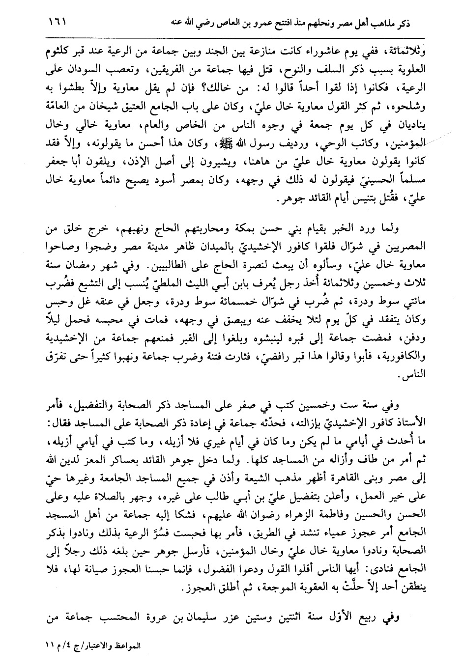 ما أحدث في أيامي ما لم يكن وما كان في أيام غيري فلا أزيله، وما كتب في أيامي أزيله، ثم أمر من طاف وأزاله من المساجد كلها. ولما دخل جوهر القائد بعساكر المعز لدين الله إلى مصر وبنى القاهرة أظهر مذهب الشيعة وأذن في جميع المساجد الجامعة وغيرها حيّ على خير العمل، وأعلن بتفضيل عليّ بن أبي طالب على غيره، وجهر بالصلاة عليه وعلى الحسن والحسين وفاطمة الزهراء رضوان الله عليهم، فشكا إليه جماعة من أهل المسجد الجامع أمر عجوز عمياء تنشد في الطريق، فأمر بها فحبست فسرّ الرعية بذلك ونادوا بذكر الصحابة ونادوا معاوية خال عليّ وخال المؤمنين، فأرسل جوهر حين بلغه ذلك رجلا إلى الجامع فنادى: أيها الناس أقلوا القول ودعوا الفضول، فإنما حبسنا العجوز صيانة لها، فلا ينطقن أحد إلّا حلّت به العقوبة الموجعة، ثم أطلق العجوز.