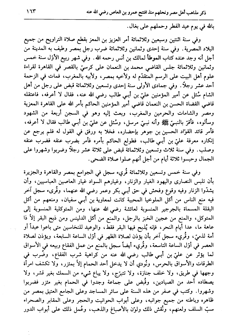 وفي سنة اثنتين وسبعين وثلاثمائة أمر العزيز بن المعز بقطع صلاة التروايح من جميع البلاد المصرية. وفي سنة إحدى وثمانين وثلاثمائة ضرب رجل بمصر وطيف به المدينة من أجل أنه وجد عنده كتاب الموطأ لمالك بن أنس رحمه الله. وفي شهر ربيع الأوّل سنة خمس وثمانين وثلاثمائة جلس القاضي محمد بن النعمان على كرسيّ بالقصر في القاهرة لقراءة علوم أهل البيت على الرسم المتقدّم له ولأخيه بمصر، ولأبيه بالمغرب، فمات في الزحمة أحد عشر رجلا. وفي جمادى الأولى سنة إحدى وتسعين وثلاثمائة قبض على رجل من أهل الشام سئل عن أمير المؤمنين عليّ بن أبي طالب رضي الله عنه، فقال لا أعرفه، فاعتقله قاضي القضاة الحسن بن النعمان قاضي أمير المؤمنين الحاكم بأمر الله على القاهرة المعزية ومصر والشامات والحرمين والمغرب، وبعث إليه وهو في السجن أربعة من الشهود وسألوه، فأقرّ بالنبيّ صلّى الله عليه وسلّم وأنه نبيّ مرسل، وسئل عن عليّ بن أبي طالب فقال لا أعرفه، فأمر قائد القوّاد الحسين بن جوهر بإحضاره، فخلا به ورفق في القول له فلم يرجع عن إنكاره معرفة عليّ بن أبي طالب، فطولع الحاكم بأمره فأمر بضرب عنقه فضرب عنقه وصلب. وفي سنة ثلاث وتسعين وثلاثمائة قبض على ثلاثة عشر رجلا وضربوا وشهروا على الجمال وحبسوا ثلاثة أيام من أجل أنهم صلوا صلاة الضحى.