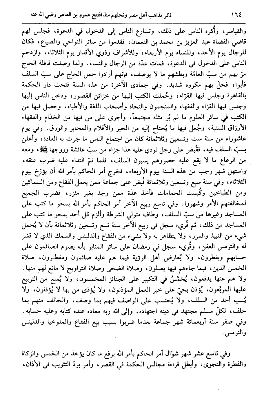 والقياسر، وأكره الناس على ذلك، وتسارع الناس إلى الدخول في الدعوة، فجلس لهم قاضي القضاة عبد العزيز بن محمد بن النعمان، فقدموا من سائر النواحي والضياع، فكان للرجال يوم الأحد، وللنساء يوم الأربعاء، وللأشراف وذوي الأقدار يوم الثلاثاء، وازدحم الناس على الدخول في الدعوة، فمات عدّة من الرجال والنساء. ولما وصلت قافلة الحاج مرّ بهم من سبّ العامّة وبطشهم ما لا يوصف، فإنهم أرادوا حمل الحاج على سبّ السلف فأبوا، فحلّ بهم مكروه شديد. وفي جمادى الآخرة من هذه السنة فتحت دار الحكمة بالقاهرة وجلس فيها القرّاء، وحملت الكتب إليها من خزائن القصور، ودخل الناس إليها وجلس فيها القرّاء والفقهاء والمنجمون والنحاة وأصحاب اللغة والأطباء، وحصل فيها من الكتب في سائر العلوم ما لم ير مثله مجتمعا، وأجرى على من فيها من الخدّام والفقهاء الأرزاق السنية، وجعل فيها ما يحتاج إليه من الحبر والأقلام والمحابر والورق. وفي يوم عاشوراء من سنة ست وتسعين وثلاثمائة كان من اجتماع الناس ما جرت به العادة، وأعلن بسبّ السلف فيه، فقبض على رجل نودي عليه هذا جزاء من سبّ عائشة وزوجها صلّى الله عليه وسلّم، ومعه من الرعاع ما لا يقع عليه حصروهم يسبون السلف، فلما تمّ النداء عليه ضرب عنقه، واستهل شهر رجب من هذه السنة بيوم الأربعاء، فخرج أمر الحاكم بأمر الله أن يؤرّخ بيوم الثلاثاء، وفي سنة سبع وتسعين وثلاثمائة قبض على جماعة ممن يعمل الفقاع ومن السماكين ومن الطباخين وكبست الحمامات فأخذ عدّة ممن وجد بغير مئزر، فضرب الجميع لمخالفتهم الأمر وشهروا. وفي تاسع ربيع الآخر أمر الحاكم بأمر الله بمحو ما كتب على المساجد وغيرها من سبّ السلف، وطاف متولي الشرطة وألزم كل أحد بمحو ما كتب على المساجد من ذلك، ثم قريء سجل في ربيع الآخر سنة تسع وتسعين وثلاثمائة بأن لا يحمل شيء من النبيذ والمزر، ولا يتظاهر به ولا بشيء من الفقاع والدلينس والسمك الذي لا قشر له والترمس العفن، وقريء سجل في رمضان على سائر المنابر بأنه يصوم الصائمون على حسابهم ويفطرون، ولا يعارض أهل الرؤية فيما هم عليه صائمون ومفطرون، صلاة الخمس الدين، فبما جاءهم فيها يصلون، وصلاة الضحى وصلاة التراويح لا مانع لهم منها.