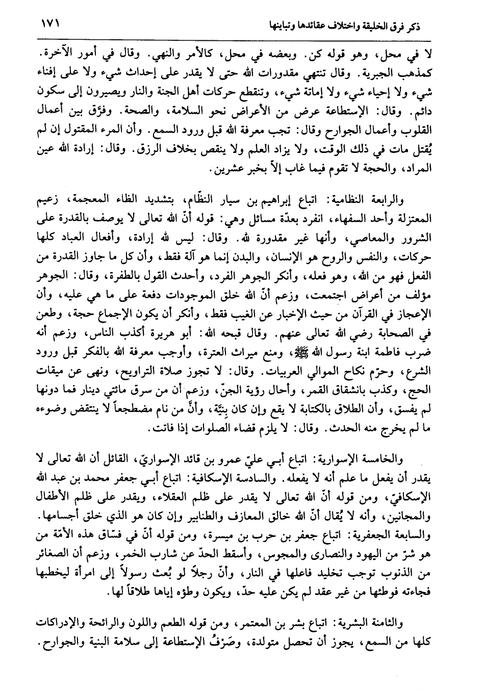 والرابعة النظامية: اتباع إبراهيم بن سيار النظّام، بتشديد الظاء المعجمة، زعيم المعتزلة وأحد السفهاء، انفرد بعدّة مسائل وهي: قوله أنّ الله تعالى لا يوصف بالقدرة على الشرور والمعاصي، وأنها غير مقدورة لله. وقال: ليس لله إرادة، وأفعال العباد كلها حركات، والنفس والروح هو الإنسان، والبدن إنما هو آلة فقط، وأن كل ما جاوز القدرة من الفعل فهو من الله، وهو فعله، وأنكر الجوهر الفرد، وأحدث القول بالطفرة، وقال: الجوهر مؤلف من أعراض اجتمعت، وزعم أنّ الله خلق الموجودات دفعة على ما هي عليه، وأن الإعجاز في القرآن من حيث الإخبار عن الغيب فقط، وأنكر أن يكون الإجماع حجة، وطعن في الصحابة رضي الله تعالى عنهم. وقال قبحه الله: أبو هريرة أكذب الناس، وزعم أنه ضرب فاطمة ابنة رسول الله صلّى الله عليه وسلّم، ومنع ميراث العترة، وأوجب معرفة الله بالفكر قبل ورود الشرع، وحرّم نكاح الموالي العربيات. وقال: لا تجوز صلاة التراويح، ونهى عن ميقات الحج، وكذب بانشقاق القمر، وأحال رؤية الجنّ، وزعم أن من سرق مائتي دينار فما دونها لم يفسق، وأن الطلاق بالكتابة لا يقع وإن كان بنيّة، وأنّ من نام مضطجعا لا ينتقض وضوءه ما لم يخرج منه الحدث. وقال: لا يلزم قضاء الصلوات إذا فاتت.