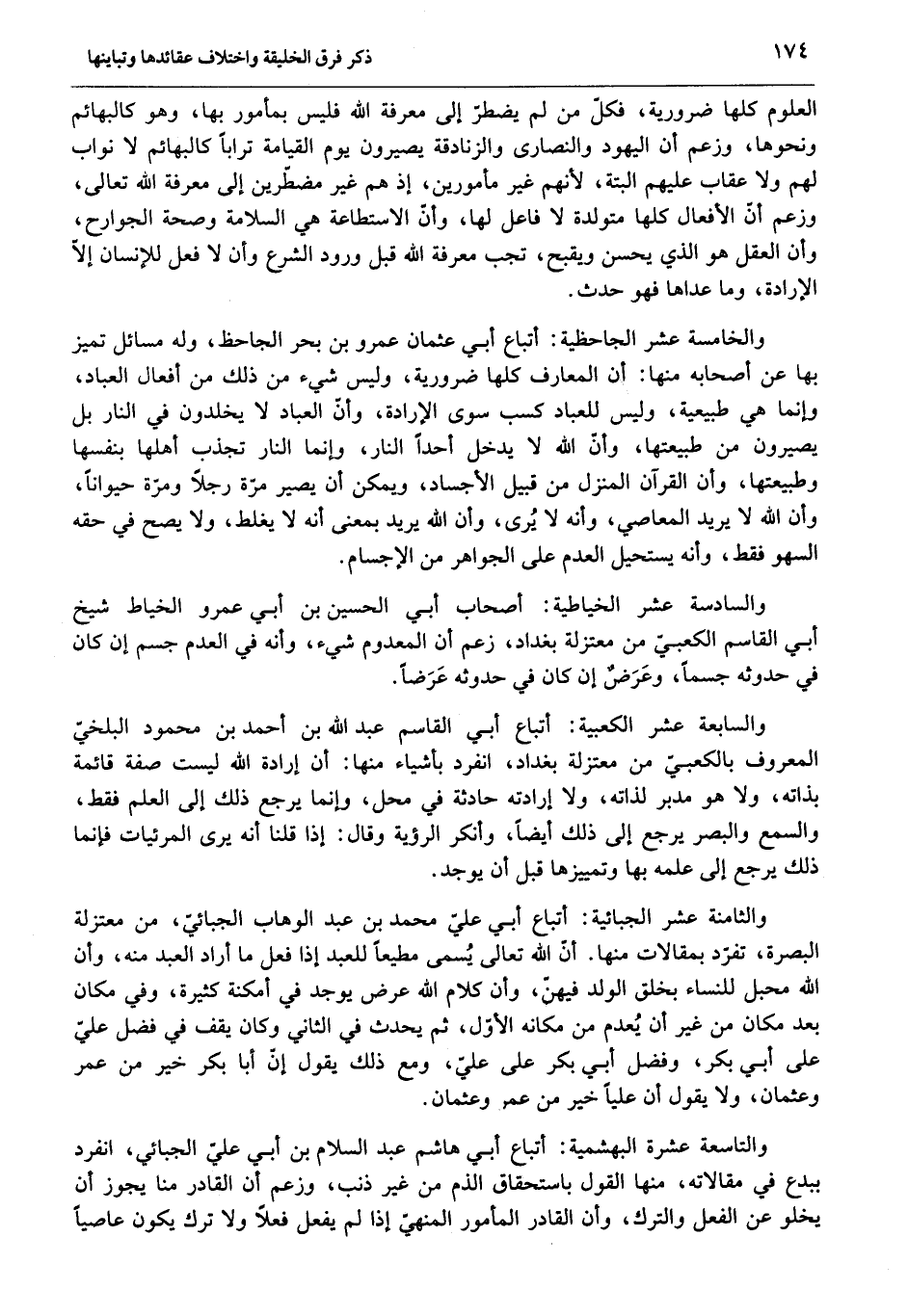 والخامسة عشر الجاحظية: أتباع أبي عثمان عمرو بن بحر الجاحظ، وله مسائل تميز بها عن أصحابه منها: أن المعارف كلها ضرورية، وليس شيء من ذلك من أفعال العباد، وإنما هي طبيعية، وليس للعباد كسب سوى الإرادة، وأنّ العباد لا يخلدون في النار بل يصيرون من طبيعتها، وأنّ الله لا يدخل أحدا النار، وإنما النار تجذب أهلها بنفسها وطبيعتها، وأن القرآن المنزل من قبيل الأجساد، ويمكن أن يصير مرّة رجلا ومرّة حيوانا، وأن الله لا يريد المعاصي، وأنه لا يرى، وأن الله يريد بمعنى أنه لا يغلط، ولا يصح في حقه السهو فقط، وأنه يستحيل العدم على الجواهر من الأجسام.