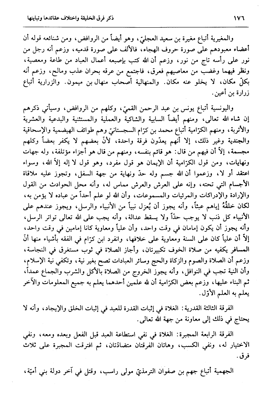 واليونسية أتباع يونس بن عبد الرحمن القميّ، وكلهم من الروافض، وسيأتي ذكرهم إن شاء الله تعالى، ومنهم أيضا السابية والشاكية والعملية والمستثنية والبدعية والعشرية والأتربة، ومنهم الكرّامية أتباع محمد بن كرّام السجستانيّ وهم طوائف الهيضمية والإسحاقية والجندية وغير ذلك، إلا أنهم يعدّون فرقة واحدة، لأنّ بعضهم لا يكفر بعضا وكلهم مجسمة، إلّا أن فيهم من قال: هو قائم بنفسه، ومنهم من قال هو أجزاء مؤتلفة، وله جهات ونهايات، ومن قول الكرّامية أن الإيمان هو قول مفرد، وهو قول لا إله إلّا الله، وسواء اعتقد أو لا، وزعموا أن الله جسم وله حدّ ونهاية من جهة السفل، وتجوز عليه ملاقاة الأجسام التي تحته، وإنه على العرش والعرش مماس له، وأنه محل الحوادث من القول والإرادة والإدراكات والمرئيات والمسموعات، وأن الله لو علم أحدا من عباده لا يؤمن به، لكان خلقه إياهم عبثا، وأنه يجوز أن يعزل نبيا من الأنبياء والرسل، ويجوز عندهم على الأنبياء كل ذنب لا يوجب حدّا ولا يسقط عدالة، وأنه يجب على الله تعالى تواتر الرسل، وأنه يجوز أن يكون إمامان في وقت واحد، وأن عليا ومعاوية كانا إمامين في وقت واحد، إلّا أن عليا كان على السنة ومعاوية على خلافها، وانفرد ابن كرّام في الفقه بأشياء منها أنّ المسافر يكفيه من صلاة الخوف تكبيرتان، وأجاز الصلاة في ثوب مستغرق في النجاسة، وزعم أن الصلاة والصوم والزكاة والحج وسائر العبادات تصح بغير نية، وتكفي نية الإسلام، وأن النية تجب في النوافل، وأنه يجوز الخروج من الصلاة بالأكل والشرب والجماع عمدا، ثم البناء عليها، وزعم بعض الكرّامية أن لله علمين أحدهما يعلم به جميع المعلومات والآخر يعلم به العلم الأوّل.