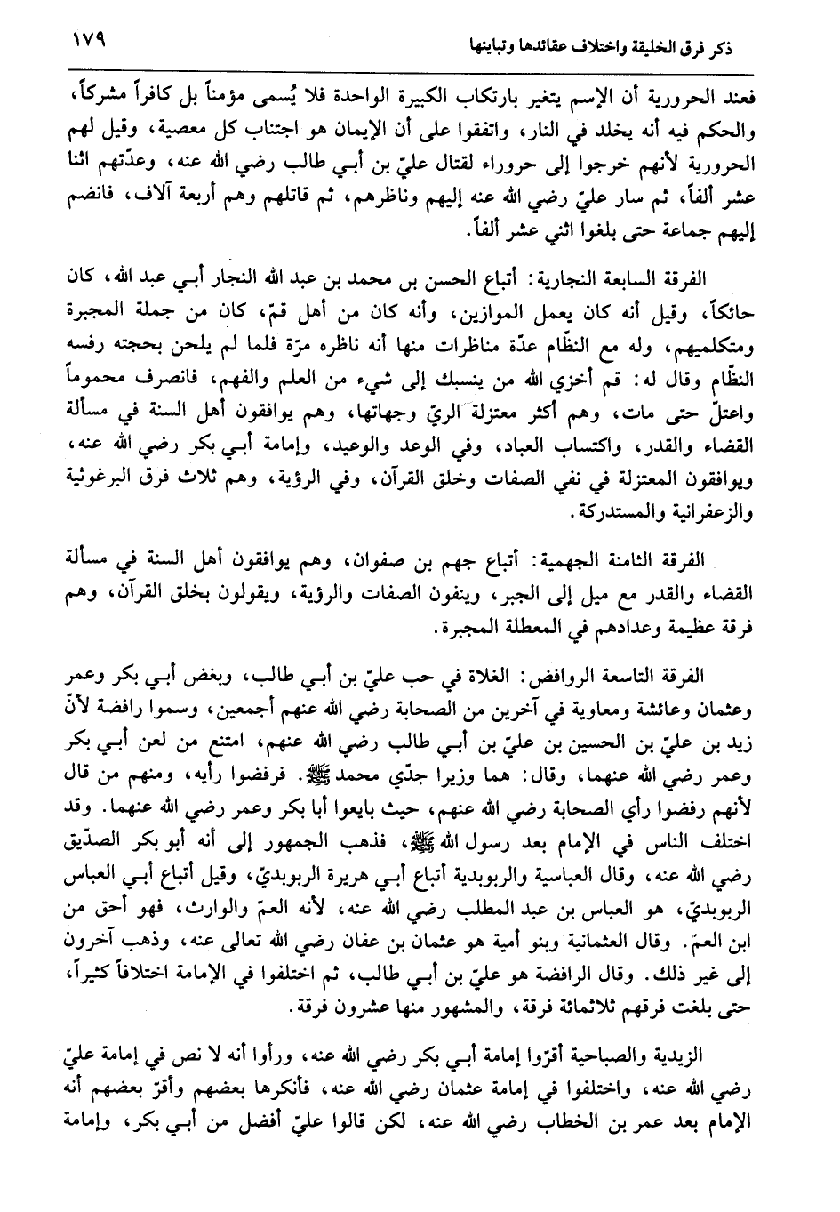 الفرقة التاسعة الروافض: الغلاة في حب عليّ بن أبي طالب، وبغض أبي بكر وعمر وعثمان وعائشة ومعاوية في آخرين من الصحابة رضي الله عنهم أجمعين، وسموا رافضة لأنّ زيد بن عليّ بن الحسين بن عليّ بن أبي طالب رضي الله عنهم، امتنع من لعن أبي بكر وعمر رضي الله عنهما، وقال: هما وزيرا جدّي محمد صلّى الله عليه وسلّم. فرفضوا رأيه، ومنهم من قال لأنهم رفضوا رأي الصحابة رضي الله عنهم، حيث بايعوا أبا بكر وعمر رضي الله عنهما. وقد اختلف الناس في الإمام بعد رسول الله صلّى الله عليه وسلّم، فذهب الجمهور إلى أنه أبو بكر الصدّيق رضي الله عنه، وقال العباسية والربوبدية أتباع أبي هريرة الربوبديّ، وقيل أتباع أبي العباس الربوبديّ، هو العباس بن عبد المطلب رضي الله عنه، لأنه العمّ والوارث، فهو أحق من ابن العمّ. وقال العثمانية وبنو أمية هو عثمان بن عفان رضي الله تعالى عنه، وذهب آخرون إلى غير ذلك. وقال الرافضة هو عليّ بن أبي طالب، ثم اختلفوا في الإمامة اختلافا كثيرا، حتى بلغت فرقهم ثلاثمائة فرقة، والمشهور منها عشرون فرقة.