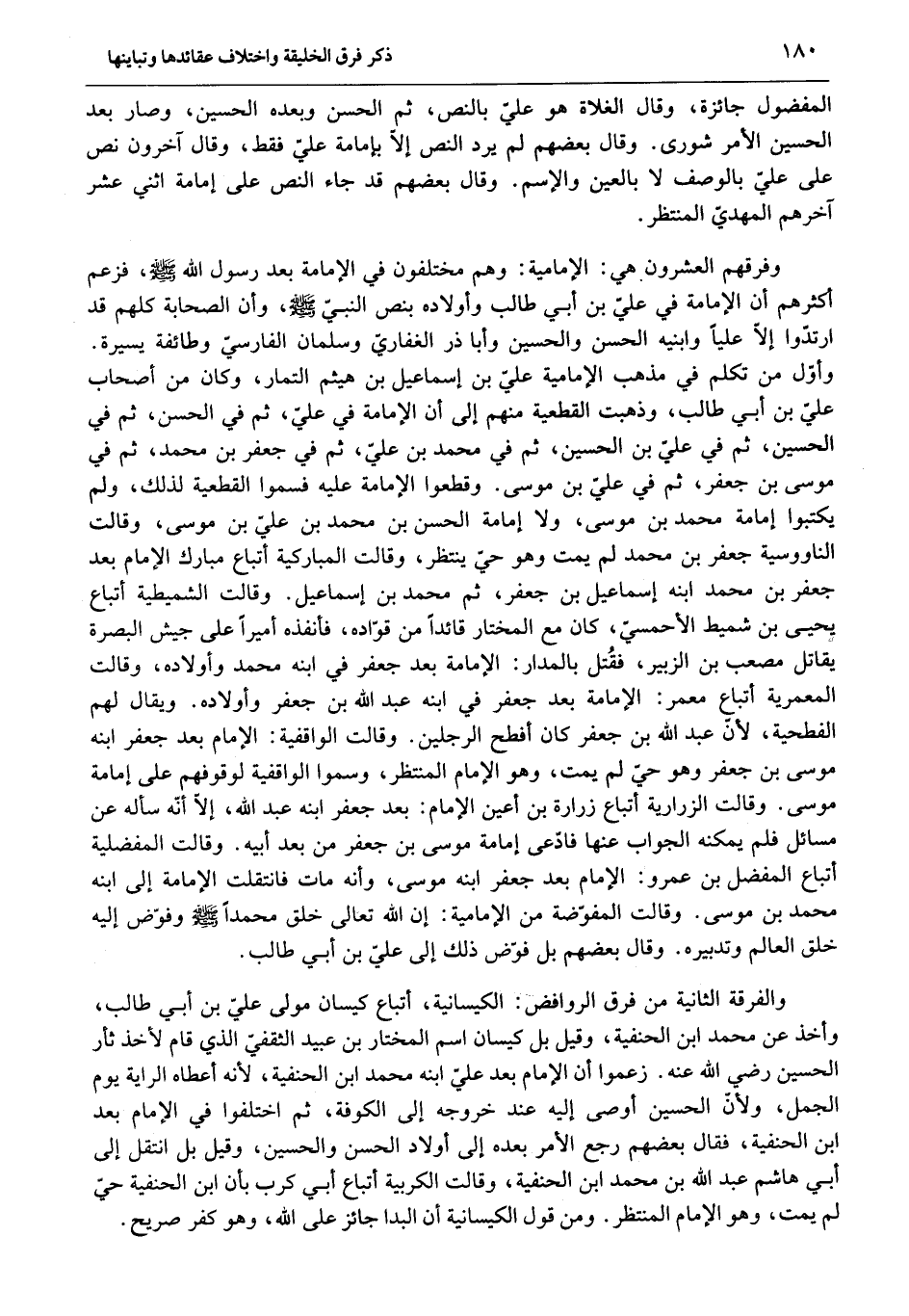 وأوّل من تكلم في مذهب الإمامية عليّ بن إسماعيل بن هيثم التمار، وكان من أصحاب عليّ بن أبي طالب، وذهبت القطعية منهم إلى أن الإمامة في عليّ، ثم في الحسن، ثم في الحسين، ثم في عليّ بن الحسين، ثم في محمد بن عليّ، ثم في جعفر بن محمد، ثم في موسى بن جعفر، ثم في عليّ بن موسى. وقطعوا الإمامة عليه فسموا القطعية لذلك، ولم يكتبوا إمامة محمد بن موسى، ولا إمامة الحسن بن محمد بن عليّ بن موسى، وقالت الناووسية جعفر بن محمد لم يمت وهو حيّ ينتظر، وقالت المباركية أتباع مبارك الإمام بعد جعفر بن محمد ابنه إسماعيل بن جعفر، ثم محمد بن إسماعيل. وقالت الشميطية أتباع يحيى بن شميط الأحمسيّ، كان مع المختار قائدا من قوّاده، فأنفذه أميرا على جيش البصرة يقاتل مصعب بن الزبير، فقتل بالمدار: الإمامة بعد جعفر في ابنه محمد وأولاده، وقالت المعمرية أتباع معمر: الإمامة بعد جعفر في ابنه عبد الله بن جعفر وأولاده. ويقال لهم الفطحية، لأنّ عبد الله بن جعفر كان أفطح الرجلين. وقالت الواقفية: الإمام بعد جعفر ابنه موسى بن جعفر وهو حيّ لم يمت، وهو الإمام المنتظر، وسموا الواقفية لوقوفهم على إمامة موسى. وقالت الزرارية أتباع زرارة بن أعين الإمام: بعد جعفر ابنه عبد الله، إلّا أنّه سأله عن مسائل فلم يمكنه الجواب عنها فادّعى إمامة موسى بن جعفر من بعد أبيه. وقالت المفضلية أتباع المفضل بن عمرو: الإمام بعد جعفر ابنه موسى، وأنه مات فانتقلت الإمامة إلى ابنه محمد بن موسى. وقالت المفوّضة من الإمامية: إن الله تعالى خلق محمدا صلّى الله عليه وسلّم وفوّض إليه خلق العالم وتدبيره. وقال بعضهم بل فوّض ذلك إلى عليّ بن أبي طالب.