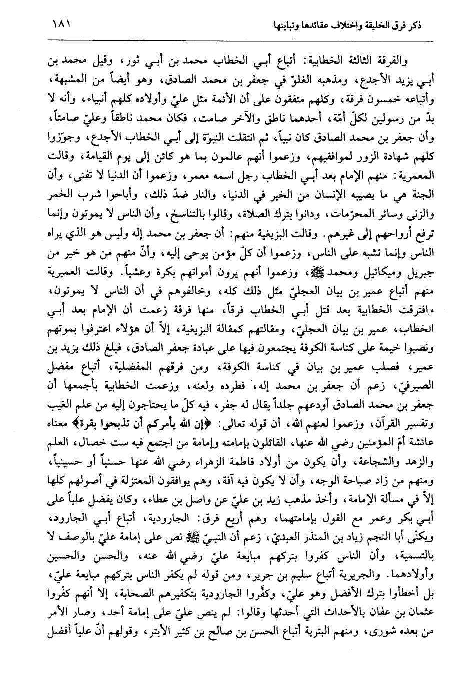 والفرقة الثالثة الخطابية: أتباع أبي الخطاب محمد بن أبي ثور، وقيل محمد بن أبي يزيد الأجدع، ومذهبه الغلوّ في جعفر بن محمد الصادق، وهو أيضا من المشبهة، وأتباعه خمسون فرقة، وكلهم متفقون على أن الأئمة مثل عليّ وأولاده كلهم أنبياء، وأنه لا بدّ من رسولين لكلّ أمّة، أحدهما ناطق والآخر صامت، فكان محمد ناطقا وعليّ صامتا، وأن جعفر بن محمد الصادق كان نبيا، ثم انتقلت النبوّة إلى أبي الخطاب الأجدع، وجوّزوا كلهم شهادة الزور لموافقيهم، وزعموا أنهم عالمون بما هو كائن إلى يوم القيامة، وقالت المعمرية: منهم الإمام بعد أبي الخطاب رجل اسمه معمر، وزعموا أن الدنيا لا تفنى، وأن الجنة هي ما يصيبه الإنسان من الخير في الدنيا، والنار ضدّ ذلك، وأباحوا شرب الخمر والزنى وسائر المحرّمات، ودانوا بترك الصلاة، وقالوا بالتناسخ، وأن الناس لا يموتون وإنما ترفع أرواحهم إلى غيرهم. وقالت البزيغية منهم: أن جعفر بن محمد إله وليس هو الذي يراه الناس وإنما تشبه على الناس، وزعموا أن كلّ مؤمن يوحى إليه، وأنّ منهم من هو خير من جبريل وميكائيل ومحمد صلّى الله عليه وسلّم، وزعموا أنهم يرون أمواتهم بكرة وعشيا. وقالت العميرية منهم أتباع عمير بن بيان العجليّ مثل ذلك كله، وخالفوهم في أن الناس لا يموتون، وافترقت الخطابية بعد قتل أبي الخطاب فرقا، منها فرقة زعمت أن الإمام بعد أبي الخطاب، عمير بن بيان العجليّ، ومقالتهم كمقالة البزيغية، إلّا أن هؤلاء اعترفوا بموتهم ونصبوا خيمة على كناسة الكوفة يجتمعون فيها على عبادة جعفر الصادق، فبلغ ذلك يزيد بن عمير، فصلب عمير بن بيان في كناسة الكوفة، ومن فرقهم المفضلية، أتباع مفضل الصيرفيّ، زعم أن جعفر بن محمد إله، فطرده ولعنه، وزعمت الخطابية بأجمعها أن جعفر بن محمد الصادق أودعهم جلدا يقال له جفر، فيه كلّ ما يحتاجون إليه من علم الغيب وتفسير القرآن، وزعموا لعنهم الله، أن قوله تعالى: إِنَّ اللَّهَ يَأْمُرُكُمْ أَنْ تَذْبَحُوا بَقَرَةً