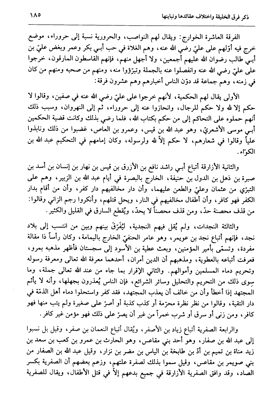 والثانية الأزارقة أتباع أبي راشد نافع بن الأزرق بن قيس بن نهار بن إنسان بن أسد بن صبرة بن ذهل بن الدول بن حنيفة، الخارج بالبصرة في أيام عبد الله بن الزبير، وهم على التبرّي من عثمان وعليّ والطعن عليهما، وأن دار مخالفيهم دار كفر، وأن من أقام بدار الكفر فهو كافر، وأن أطفال مخالفيهم في النار، ويحل قتلهم، وأنكروا رجم الزاني وقالوا:
