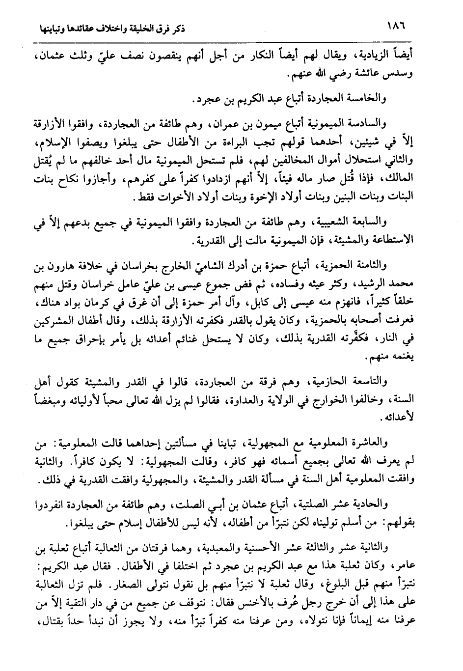 والثانية عشر والثالثة عشر الأحسنية والمعبدية، وهما فرقتان من الثعالبة أتباع ثعلبة بن عامر، وكان ثعلبة هذا مع عبد الكريم بن عجرد ثم اختلفا في الأطفال. فقال عبد الكريم: