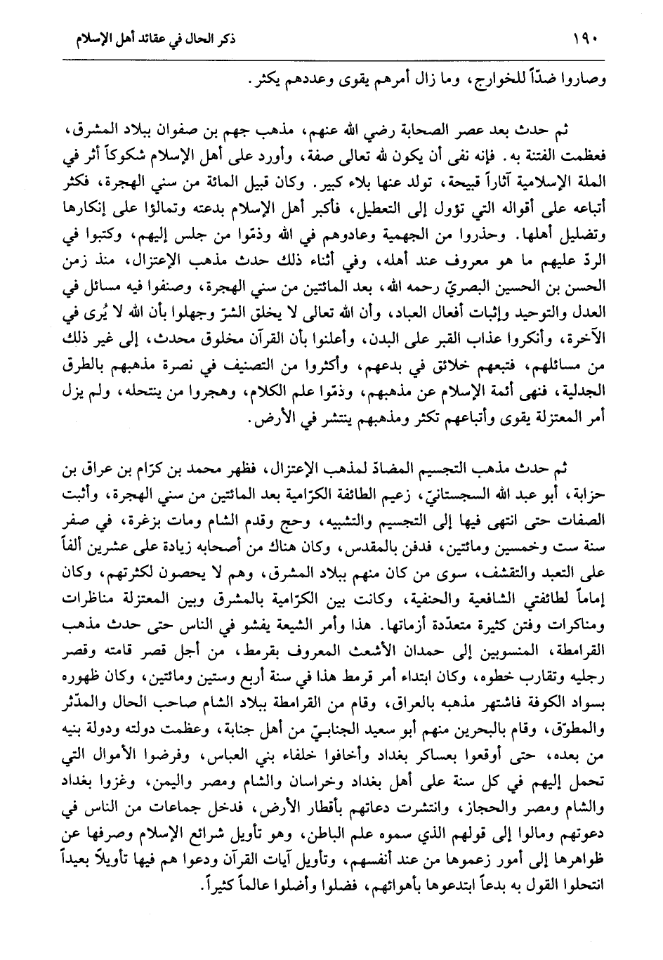 ثم حدث بعد عصر الصحابة رضي الله عنهم، مذهب جهم بن صفوان ببلاد المشرق، فعظمت الفتنة به. فإنه نفى أن يكون لله تعالى صفة، وأورد على أهل الإسلام شكوكا أثر في الملة الإسلامية آثارا قبيحة، تولد عنها بلاء كبير. وكان قبيل المائة من سني الهجرة، فكثر أتباعه على أقواله التي تؤول إلى التعطيل، فأكبر أهل الإسلام بدعته وتمالؤا على إنكارها وتضليل أهلها. وحذروا من الجهمية وعادوهم في الله وذمّوا من جلس إليهم، وكتبوا في الردّ عليهم ما هو معروف عند أهله، وفي أثناء ذلك حدث مذهب الاعتزال، منذ زمن الحسن بن الحسين البصريّ رحمه الله، بعد المائتين من سني الهجرة، وصنفوا فيه مسائل في العدل والتوحيد وإثبات أفعال العباد، وأن الله تعالى لا يخلق الشرّ وجهلوا بأن الله لا يرى في الآخرة، وأنكروا عذاب القبر على البدن، وأعلنوا بأن القرآن مخلوق محدث، إلى غير ذلك من مسائلهم، فتبعهم خلائق في بدعهم، وأكثروا من التصنيف في نصرة مذهبهم بالطرق الجدلية، فنهى أئمة الإسلام عن مذهبهم، وذمّوا علم الكلام، وهجروا من ينتحله، ولم يزل أمر المعتزلة يقوى وأتباعهم تكثر ومذهبهم ينتشر في الأرض.