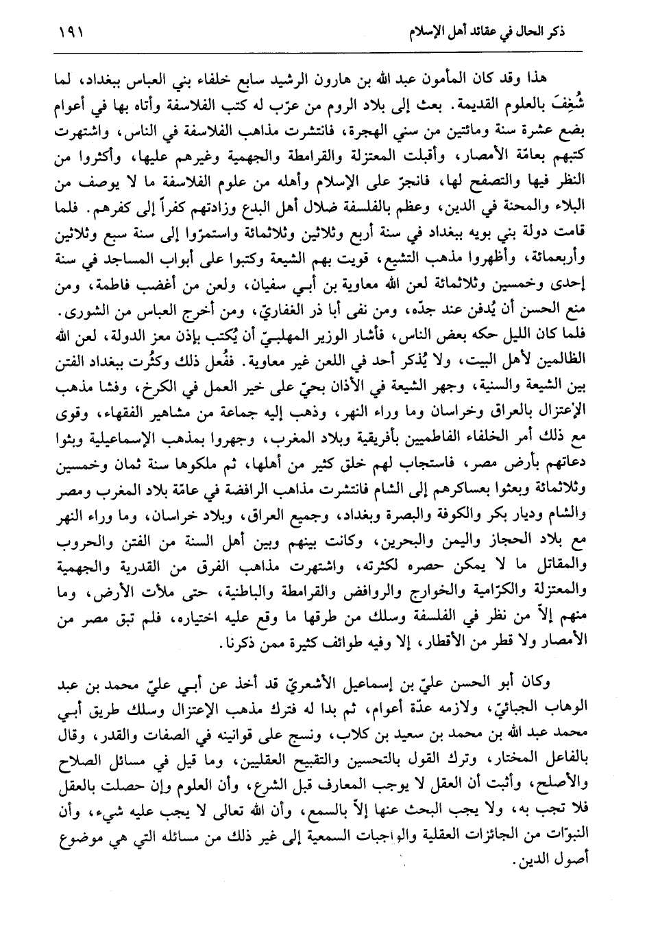 هذا وقد كان المأمون عبد الله بن هارون الرشيد سابع خلفاء بني العباس ببغداد، لما شغف بالعلوم القديمة. بعث إلى بلاد الروم من عرّب له كتب الفلاسفة وأتاه بها في أعوام بضع عشرة سنة ومائتين من سني الهجرة، فانتشرت مذاهب الفلاسفة في الناس، واشتهرت كتبهم بعامّة الأمصار، وأقبلت المعتزلة والقرامطة والجهمية وغيرهم عليها، وأكثروا من النظر فيها والتصفح لها، فانجرّ على الإسلام وأهله من علوم الفلاسفة ما لا يوصف من البلاء والمحنة في الدين، وعظم بالفلسفة ضلال أهل البدع وزادتهم كفرا إلى كفرهم. فلما قامت دولة بني بويه ببغداد في سنة أربع وثلاثين وثلاثمائة واستمرّوا إلى سنة سبع وثلاثين وأربعمائة، وأظهروا مذهب التشيع، قويت بهم الشيعة وكتبوا على أبواب المساجد في سنة إحدى وخمسين وثلاثمائة لعن الله معاوية بن أبي سفيان، ولعن من أغضب فاطمة، ومن منع الحسن أن يدفن عند جدّه، ومن نفى أبا ذر الغفاريّ، ومن أخرج العباس من الشورى.