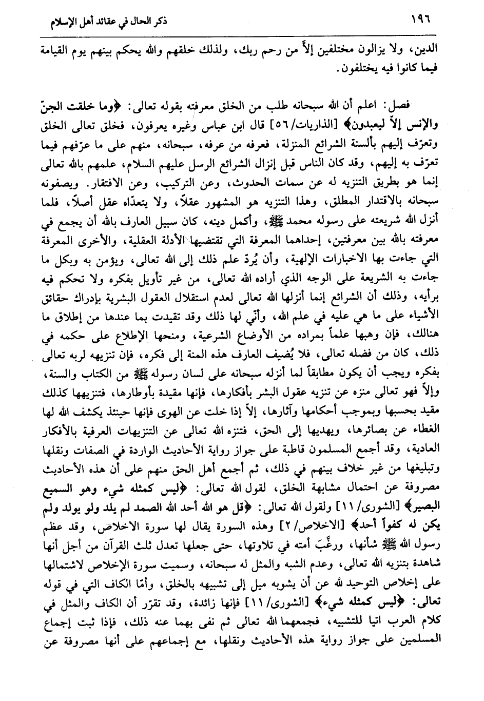 [الشورى/ 11] ولقول الله تعالى: قُلْ هُوَ اللَّهُ أَحَدٌ اللَّهُ الصَّمَدُ لَمْ يَلِدْ وَلَمْ يُولَدْ وَلَمْ يَكُنْ لَهُ كُفُواً أَحَدٌ