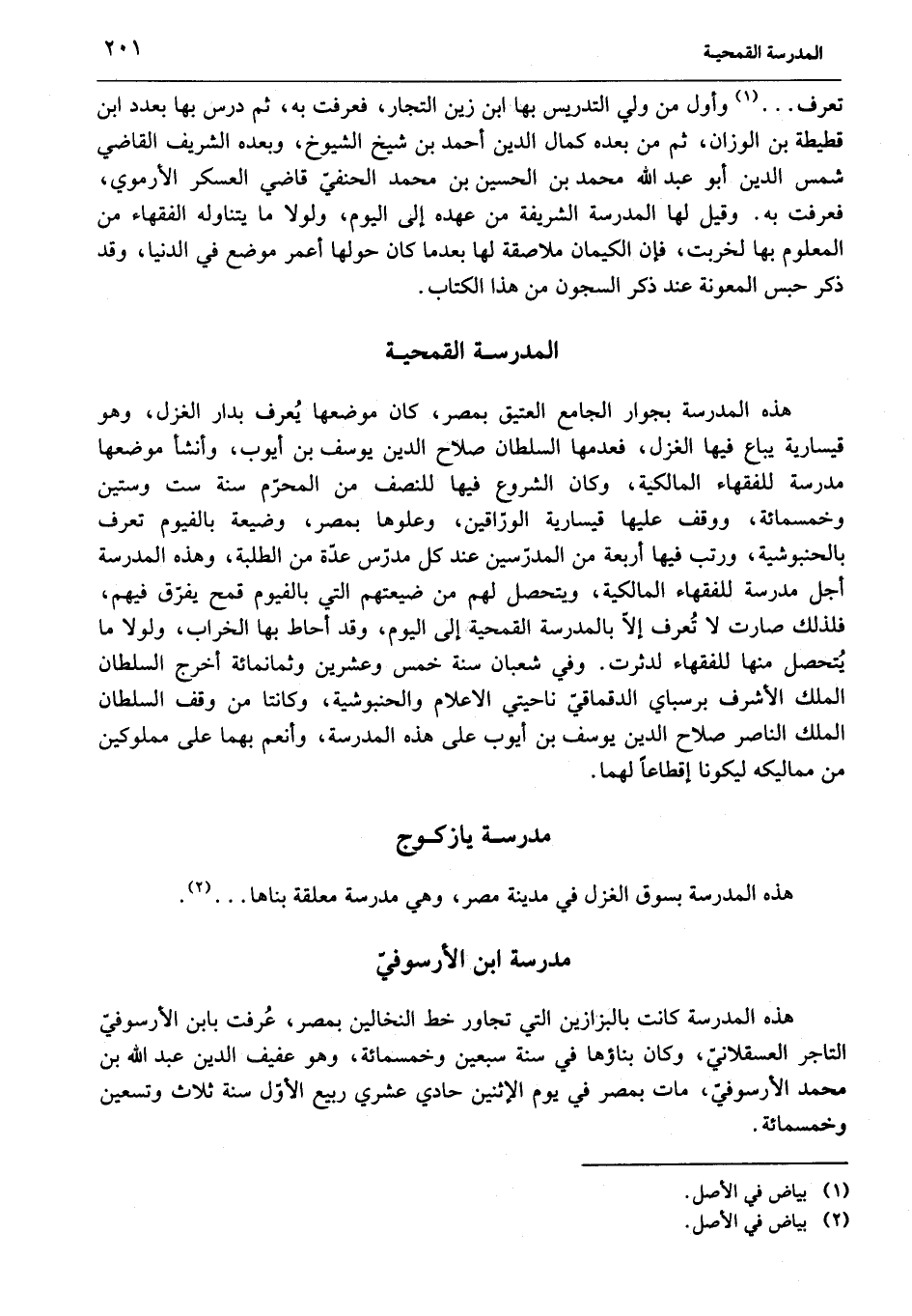 تعرف ... «1» وأول من ولي التدريس بها ابن زين التجار، فعرفت به، ثم درس بها بعدد ابن قطيطة بن الوزان، ثم من بعده كمال الدين أحمد بن شيخ الشيوخ، وبعده الشريف القاضي شمس الدين أبو عبد الله محمد بن الحسين بن محمد الحنفيّ قاضي العسكر الأرموي، فعرفت به. وقيل لها المدرسة الشريفة من عهده إلى اليوم، ولولا ما يتناوله الفقهاء من المعلوم بها لخربت، فإن الكيمان ملاصقة لها بعد ما كان حولها أعمر موضع في الدنيا، وقد ذكر حبس المعونة عند ذكر السجون من هذا الكتاب.