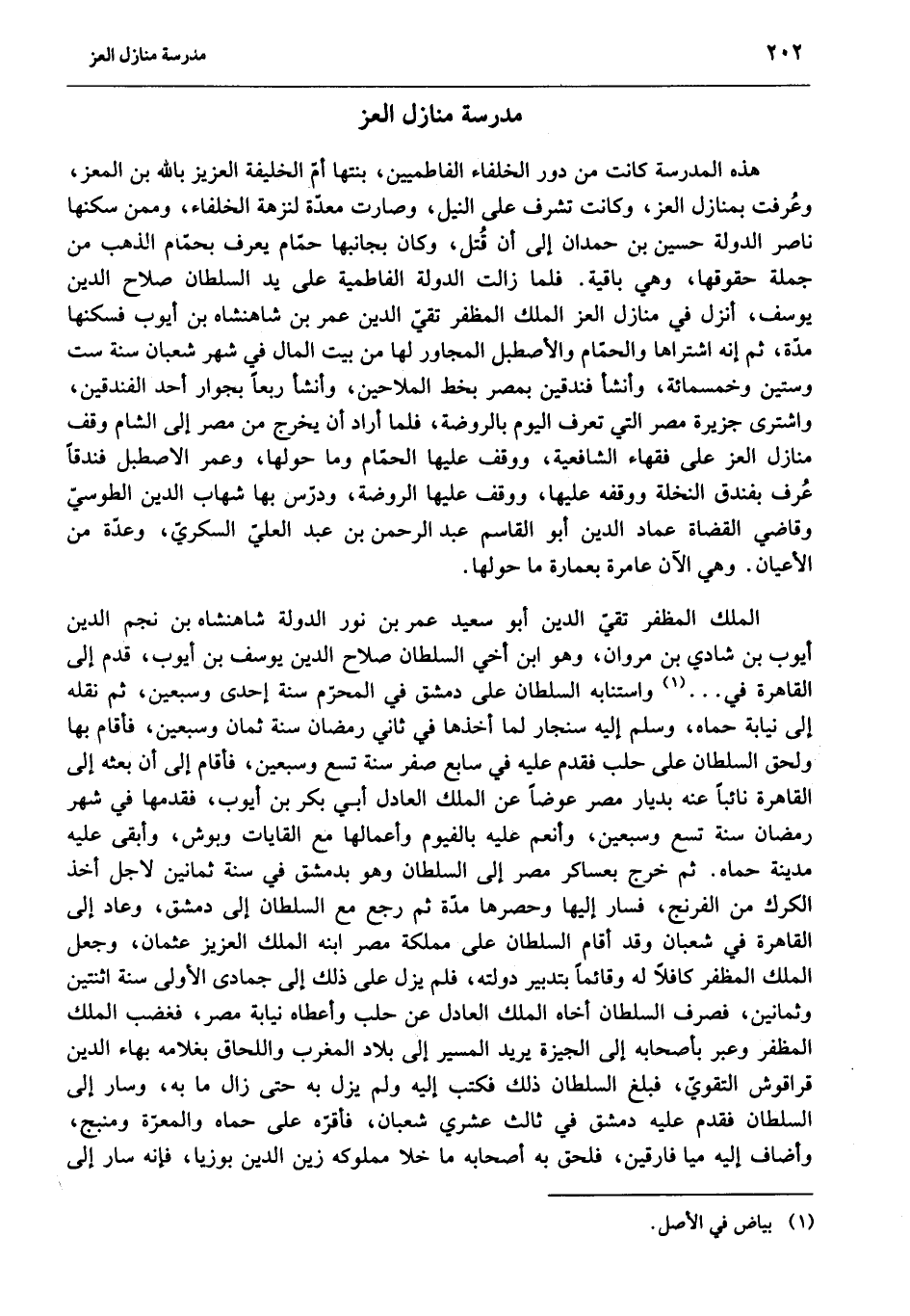 هذه المدرسة كانت من دور الخلفاء الفاطميين، بنتها أمّ الخليفة العزيز بالله بن المعز، وعرفت بمنازل العز، وكانت تشرف على النيل، وصارت معدّة لنزهة الخلفاء، وممن سكنها ناصر الدولة حسين بن حمدان إلى أن قتل، وكان بجانبها حمّام يعرف بحمّام الذهب من جملة حقوقها، وهي باقية. فلما زالت الدولة الفاطمية على يد السلطان صلاح الدين يوسف، أنزل في منازل العز الملك المظفر تقيّ الدين عمر بن شاهنشاه بن أيوب فسكنها مدّة، ثم إنه اشتراها والحمّام والإصطبل المجاور لها من بيت المال في شهر شعبان سنة ست وستين وخمسمائة، وأنشأ فندقين بمصر بخط الملاحين، وأنشأ ربعا بجوار أحد الفندقين، واشترى جزيرة مصر التي تعرف اليوم بالروضة، فلما أراد أن يخرج من مصر إلى الشام وقف منازل العز على فقهاء الشافعية، ووقف عليها الحمّام وما حولها، وعمر الاصطبل فندقا عرف بفندق النخلة ووقفه عليها، ووقف عليها الروضة، ودرّس بها شهاب الدين الطوسيّ وقاضي القضاة عماد الدين أبو القاسم عبد الرحمن بن عبد العليّ السكريّ، وعدّة من الأعيان. وهي الآن عامرة بعمارة ما حولها.