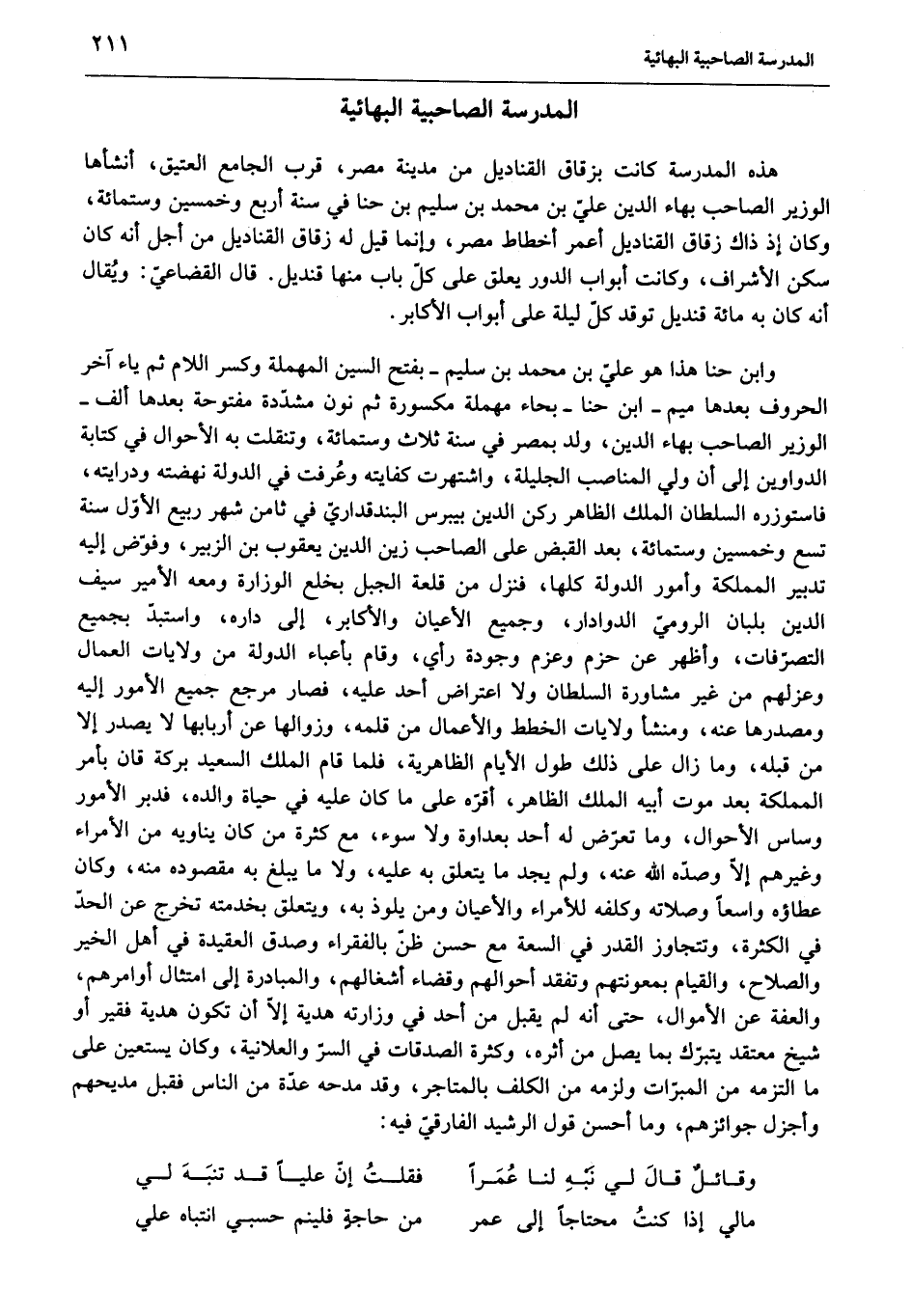 وابن حنا هذا هو عليّ بن محمد بن سليم- بفتح السين المهملة وكسر اللام ثم ياء آخر الحروف بعدها ميم- ابن حنا- بحاء مهملة مكسورة ثم نون مشدّدة مفتوحة بعدها ألف- الوزير الصاحب بهاء الدين، ولد بمصر في سنة ثلاث وستمائة، وتنقلت به الأحوال في كتابة الدواوين إلى أن ولي المناصب الجليلة، واشتهرت كفايته وعرفت في الدولة نهضته ودرايته، فاستوزره السلطان الملك الظاهر ركن الدين بيبرس البندقداريّ في ثامن شهر ربيع الأوّل سنة تسع وخمسين وستمائة، بعد القبض على الصاحب زين الدين يعقوب بن الزبير، وفوّض إليه تدبير المملكة وأمور الدولة كلها، فنزل من قلعة الجبل بخلع الوزارة ومعه الأمير سيف الدين بلبان الروميّ الدوادار، وجميع الأعيان والأكابر، إلى داره، واستبدّ بجميع التصرّفات، وأظهر عن حزم وعزم وجودة رأي، وقام بأعباء الدولة من ولايات العمال وعزلهم من غير مشاورة السلطان ولا اعتراض أحد عليه، فصار مرجع جميع الأمور إليه ومصدرها عنه، ومنشأ ولايات الخطط والأعمال من قلمه، وزوالها عن أربابها لا يصدر إلا من قبله، وما زال على ذلك طول الأيام الظاهرية، فلما قام الملك السعيد بركة قان بأمر المملكة بعد موت أبيه الملك الظاهر، أقرّه على ما كان عليه في حياة والده، فدبر الأمور وساس الأحوال، وما تعرّض له أحد بعداوة ولا سوء، مع كثرة من كان يناويه من الأمراء وغيرهم إلّا وصدّه الله عنه، ولم يجد ما يتعلق به عليه، ولا ما يبلغ به مقصوده منه، وكان عطاؤه واسعا وصلاته وكلفه للأمراء والأعيان ومن يلوذ به، ويتعلق بخدمته تخرج عن الحدّ في الكثرة، وتتجاوز القدر في السعة مع حسن ظنّ بالفقراء وصدق العقيدة في أهل الخير والصلاح، والقيام بمعونتهم وتفقد أحوالهم وقضاء أشغالهم، والمبادرة إلى امتثال أوامرهم، والعفة عن الأموال، حتى أنه لم يقبل من أحد في وزارته هدية إلّا أن تكون هدية فقير أو شيخ معتقد يتبرّك بما يصل من أثره، وكثرة الصدقات في السرّ والعلانية، وكان يستعين على ما التزمه من المبرّات ولزمه من الكلف بالمتاجر، وقد مدحه عدّة من الناس فقبل مديحهم وأجزل جوائزهم، وما أحسن قول الرشيد الفارقيّ فيه: