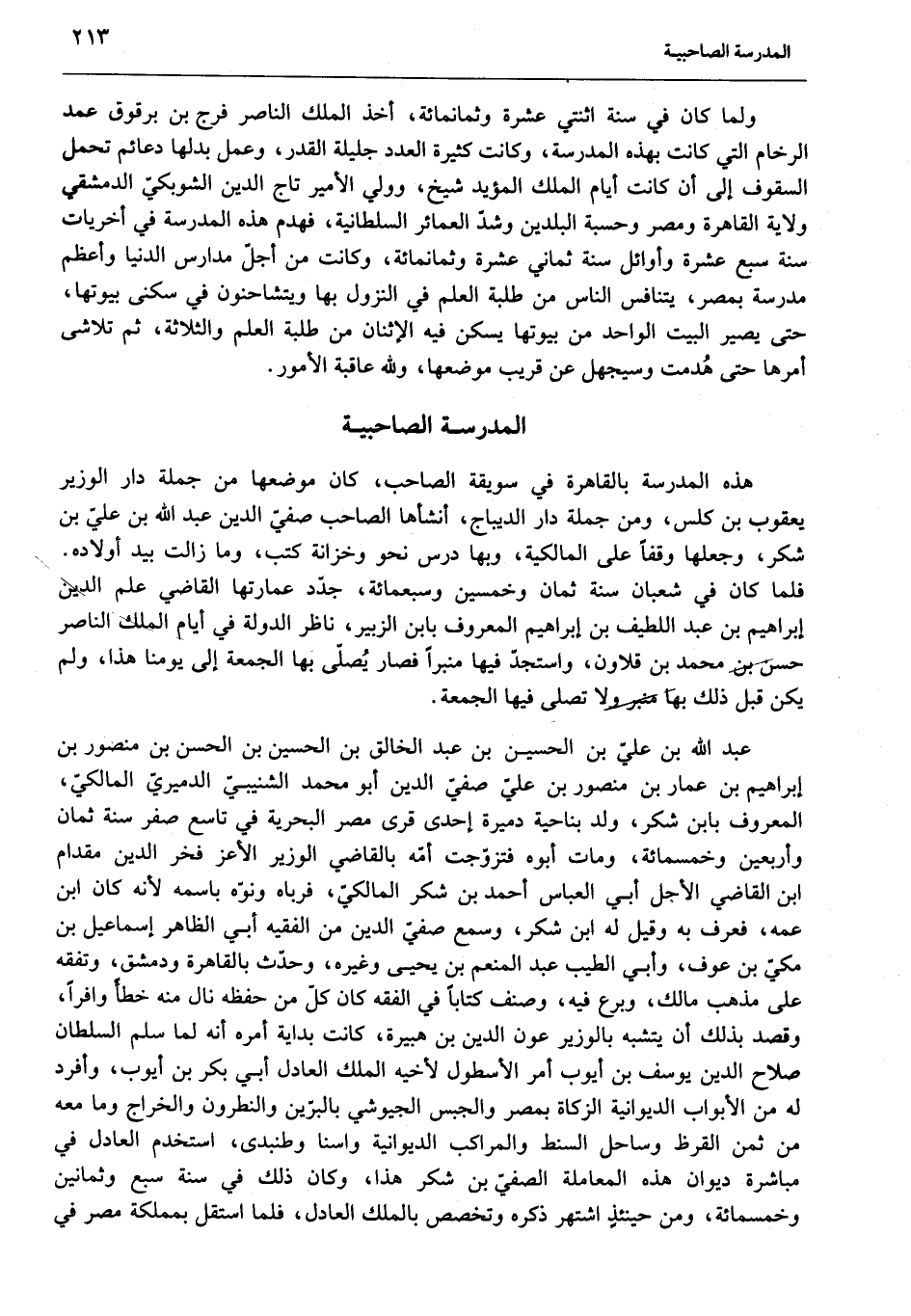 ولما كان في سنة اثنتي عشرة وثمانمائة، أخذ الملك الناصر فرج بن برقوق عمد الرخام التي كانت بهذه المدرسة، وكانت كثيرة العدد جليلة القدر، وعمل بدلها دعائم تحمل السقوف إلى أن كانت أيام الملك المؤيد الشيخ، وولي الأمير تاج الدين الشوبكيّ الدمشقي ولاية القاهرة ومصر وحسبة البلدين وشدّ العمائر السلطانية، فهدم هذه المدرسة في أخريات سنة سبع عشرة وأوائل سنة ثماني عشرة وثمانمائة، وكانت من أجلّ مدارس الدنيا وأعظم مدرسة بمصر، يتنافس الناس من طلبة العلم في النزول بها ويتشاحنون في سكنى بيوتها، حتى يصير البيت الواحد من بيوتها يسكن فيه الاثنان من طلبة العلم والثلاثة، ثم تلاشى أمرها حتى هدمت وسيجهل عن قريب موضعها، ولله عاقبة الأمور.