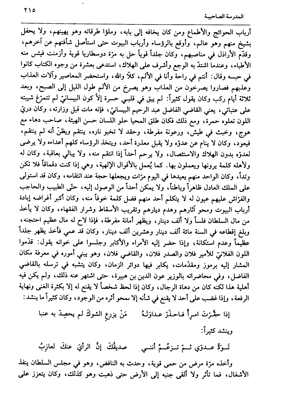 أرباب الحوائج والأطماع ومن كان يخافه إلى بابه، وملؤا طرقاته وهو يهينهم، ولا يحفل بشيخ منهم وهو عالم، وأوقع بالرؤساء وأرباب البيوت حتى استأصل شأفتهم عن آخرهم، وقدّم الأراذل في مناصبهم، وكان جلدا قويا حل به مرّة دوسطاريا قوية وأزمنت فيئس منه الأطباء، وعند ما اشتدّ به الوجع وأشرف على الهلاك، استدعى بعشرة من وجوه الكتاب كانوا في حبسه وقال: أنتم في راحة وأنا في الألم، كلّا والله، واستحضر المعاصير وآلات العذاب وعذبهم فصاروا يصرخون من العذاب وهو يصرخ من الألم طول الليل إلى الصبح، وبعد ثلاثة أيام ركب وكان يقول كثيرا: لم يبق في قلبي حسرة إلّا كون البيسانيّ لم تتمرّغ شيبته على عتباتي، يعني القاضي الفاضل عبد الرحيم البيسانيّ، فإنه مات قبل وزارته، وكان دريّ اللون تعلوه حمرة، ومع ذلك فكان طلق المحيا حلو اللسان حسن الهيئة، صاحب دهاء مع هوج، وخبث في طيش، ورعونة مفرطة، وحقد لا تخبو ناره، ينتقم ويظنّ أنه لم ينتقم، فيعود، وكان لا ينام عن عدوّه ولا يقبل معذرة أحد، ويتخذ الرؤساء كلهم أعداءه ولا يرضى لعدوّه بدون الهلاك والاستئصال، ولا يرحم أحدا إذا انتقم منه، ولا يبالي بعاقبة، وكان له ولأهله كلمة يرونها ويعملون بها. كما يعمل بالأقوال الإلهية، وهي إذا كنت دقماقا فلا تكن وتدا، وكان الواحد منهم يعيدها في اليوم مرّات ويجعلها حجة عند انتقامه، وكان قد استولى على الملك العادل ظاهرا وباطنا، ولا يمكن أحدا من الوصول إليه، حتّى الطبيب والحاجب والفرّاش عليهم عيون له لا يتكلم أحد منهم فضل كلمة خوفا منه، وكان أكبر أغراضه إبادة أرباب البيوت ومحو آثارهم وهدم ديارهم وتقريب الأسقاط وشرار الفقهاء، وكان لا يأخذ من مال السلطان فلسا ولا ألف دينار، ويظهر أمانة مفرطة، فإذا لاح له مال عظيم احتجنه، وبلغ إقطاعه في السنة مائة ألف دينار وعشرين ألف دينار، وكان قد عمي فأخذ يظهر جلدا عظيما وعدم استكانة، وإذا حضر إليه الأمراء والأكابر وجلسوا على خوانه يقول: قدّموا اللون الفلانيّ للأمير فلان والصدر فلان، والقاضي فلان، وهو يبني أموره في معرفة مكان المشار إليه برموز ومقدّمات، يكابر فيها دوائر الزمان، وكان يتشبه في ترسله بالقاضي الفاضل، وفي محاضراته بالوزير عون الدين بن هبيرة، حتى اشتهر عنه ذلك، ولم يكن فيه أهلية هذا لكنه كان من دهاة الرجال، وكان إذا لحظ شخصا لا يقنع له إلا بكثرة الغنى ونهاية الرفعة، وإذا غضب على أحد لا يقنع في شأنه إلا بمحو أثره من الوجود، وكان كثيرا ما ينشد: