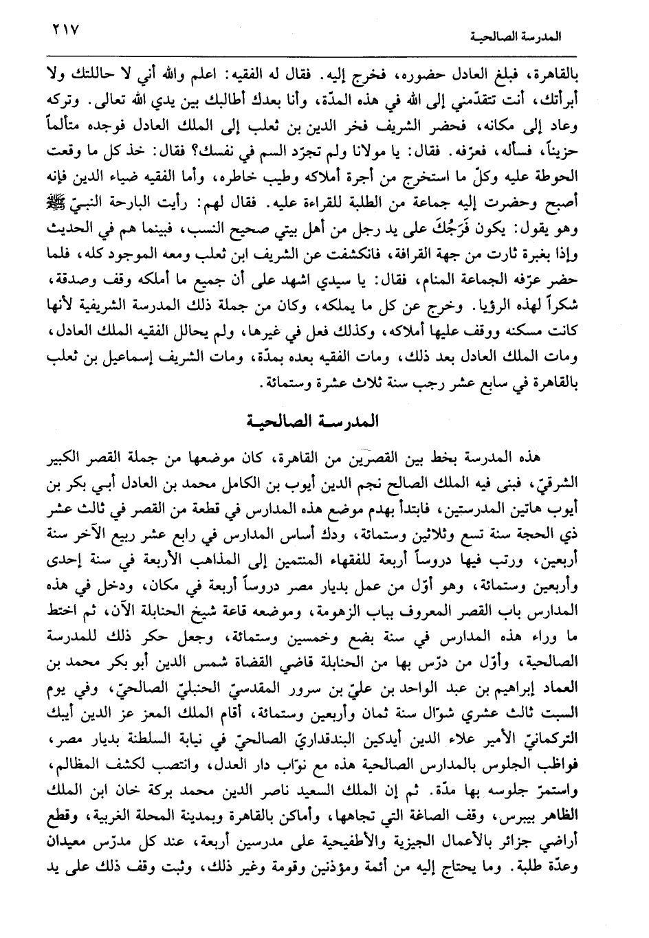 بالقاهرة، فبلغ العادل حضوره، فخرج إليه. فقال له الفقيه: اعلم والله أني لا حاللتك ولا أبرأتك، أنت تتقدّمني إلى الله في هذه المدّة، وأنا بعدك أطالبك بين يدي الله تعالى. وتركه وعاد إلى مكانه، فحضر الشريف فخر الدين بن ثعلب إلى الملك العادل فوجده متألما حزينا، فسأله، فعرّفه. فقال: يا مولانا ولم تجرّد السم في نفسك؟ فقال: خذ كل ما وقعت الحوطة عليه وكلّ ما استخرج من أجرة أملاكه وطيب خاطره، وأما الفقيه ضياء الدين فإنه أصبح وحضرت إليه جماعة من الطلبة للقراءة عليه. فقال لهم: رأيت البارحة النبيّ صلّى الله عليه وسلّم وهو يقول: يكون فرجك على يد رجل من أهل بيتي صحيح النسب، فبينما هم في الحديث وإذا بغبرة ثارت من جهة القرافة، فانكشفت عن الشريف ابن ثعلب ومعه الموجود كله، فلما حضر عرّفه الجماعة المنام، فقال: يا سيدي اشهد على أن جميع ما أملكه وقف وصدقة، شكرا لهذه الرؤيا. وخرج عن كل ما يملكه، وكان من جملة ذلك المدرسة الشريفية لأنها كانت مسكنه ووقف عليها أملاكه، وكذلك فعل في غيرها، ولم يحالل الفقيه الملك العادل، ومات الملك العادل بعد ذلك، ومات الفقيه بعده بمدّة، ومات الشريف إسماعيل بن ثعلب بالقاهرة في سابع عشر رجب سنة ثلاث عشرة وستمائة.