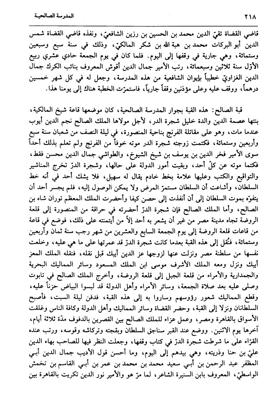 قبة الصالح: هذه القبة بجوار المدرسة الصالحية، كان موضعها قاعة شيخ المالكية، بنتها عصمة الدين والدة خليل شجرة الدر، لأجل مولاها الملك الصالح نجم الدين أيوب عندما مات، وهو على مقاتلة الفرنج بناحية المنصورة، في ليلة النصف من شعبان سنة سبع وأربعين وستمائة، فكتمت زوجته شجرة الدر موته خوفا من الفرنج ولم تعلم بذلك أحدا سوى الأمير فخر الدين بن يوسف بن شيخ الشيوخ، والطواشي جمال الدين محسن فقط، فكتما موته عن كلّ أحد، وبقيت أمور الدولة على حالها، وشجرة الدرّ تخرج المناشير والتواقيع والكتب وعليها علامة بخط خادم يقال له سهيل، فلا يشك أحد في أنه خط السلطان، وأشاعت أن السلطان مستمرّ المرض ولا يمكن الوصول إليه، فلم يجسر أحد أن يتفوّه بموت السلطان إلى أن أنفذت إلى حصن كيفا وأحضرت الملك المعظم توران شاه بن الصالح، وأما الملك الصالح فإن شجرة الدرّ أحضرته في حراقة من المنصورة إلى قلعة الروضة تجاه مدينة مصر من غير أن يشعر به أحد إلّا من أيتمنته على ذلك، فوضع في قاعة من قاعات قلعة الروضة إلى يوم الجمعة السابع والعشرين من شهر رجب سنة ثمان وأربعين وستمائة، فنقل إلى هذه القبة بعد ما كانت شجرة الدرّ قد عمرتها على ما هي عليه، وخلعت نفسها من سلطنة مصر ونزلت عنها لزوجها عز الدين أيبك قبل نقله، فنقله الملك المعز أيبك ونزل ومعه الملك الأشرف موسى ابن الملك المسعود وسائر المماليك البحرية والجمدارية والأمراء من قلعة الجبل إلى قلعة الروضة، وأخرج الملك الصالح في تابوت وصلّى عليه بعد صلاة الجمعة، وسائر الأمراء وأهل الدولة قد لبسوا البياض حزنا عليه، وقطع المماليك شعور رؤوسهم وساروا به إلى هذه الدولة قد لبسوا البياض حزنا عليه، السلطانان ونزلا إلى القبة، وحضر القضاة وسائر المماليك وأهل الدولة وكافة الناس وغلقت الأسواق بالقاهرة ومصر، وعمل عزاء للملك الصالح بين القصرين بالدفوف مدّة ثلاثة أيام، آخرها يوم الاثنين. ووضع عند القبر سناجق السلطان وبقجته وتركاشه وقوسه، ورتب عنده القرّاء على ما شرطت شجرة الدرّ في كتاب وقفها، وجعلت النظر فيها للصاحب بهاء الدين عليّ بن حنا وذريته، وهي بيدهم إلى اليوم، وما أحسن قول الأديب جمال الدين أبي المظفر عبد الرحمن بن أبي سعيد محمد بن محمد بن عمر بن أبي القاسم بن تخمش الواسطيّ، المعروف بابن السنيرة الشاعر، لما مرّ هو والأمير نور الدين تكريت بالقاهرة بين