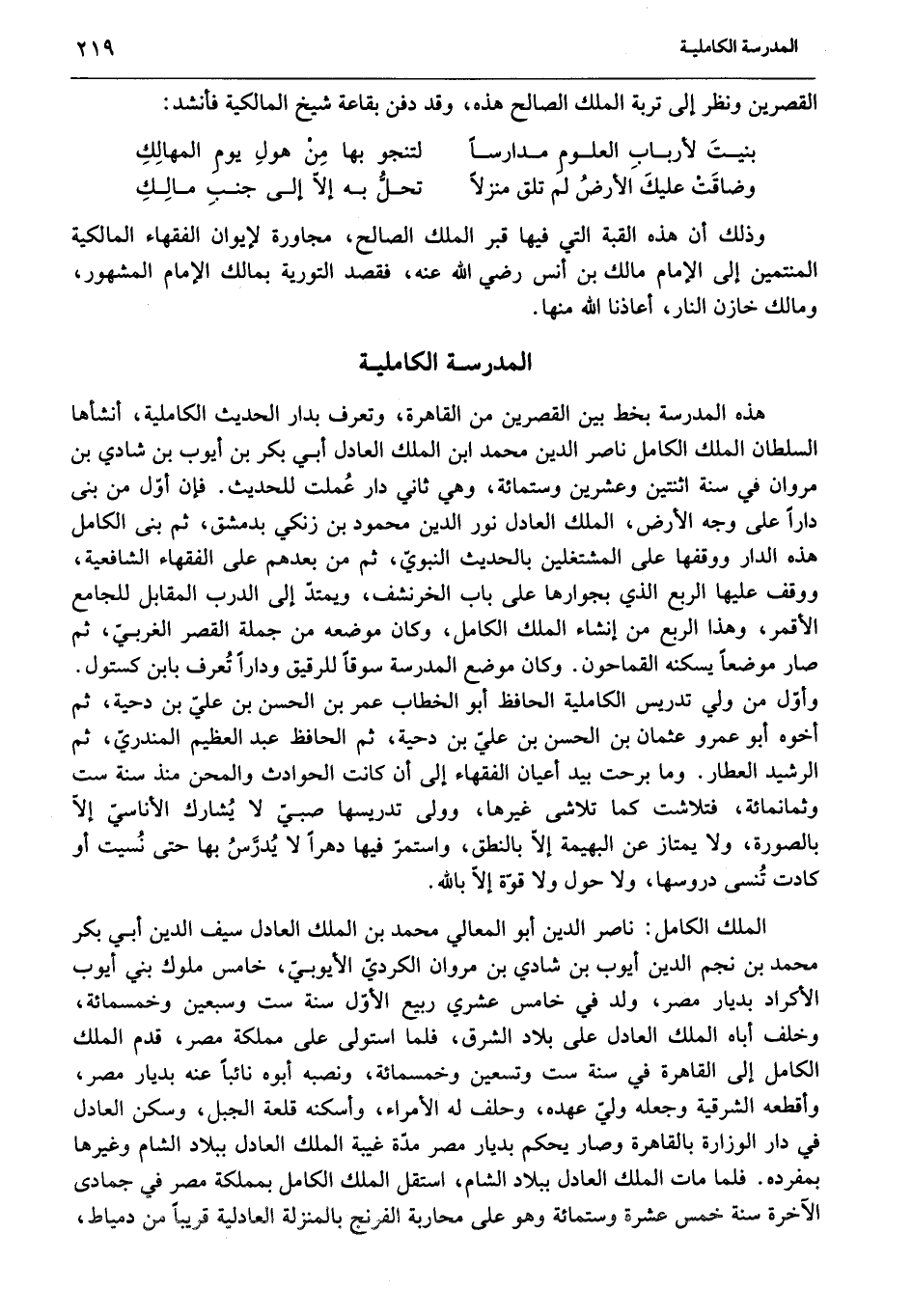وأوّل من ولي تدريس الكاملية الحافظ أبو الخطاب عمر بن الحسن بن عليّ بن دحية، ثم أخوه أبو عمرو عثمان بن الحسن بن عليّ بن دحية، ثم الحافظ عبد العظيم المندريّ، ثم الرشيد العطار. وما برحت بيد أعيان الفقهاء إلى أن كانت الحوادث والمحن منذ سنة ست وثمانمائة، فتلاشت كما تلاشى غيرها، وولى تدريسها صبيّ لا يشارك الأناسيّ إلّا بالصورة، ولا يمتاز عن البهيمة إلّا بالنطق، واستمرّ فيها دهرا لا يدرّس بها حتى نسيت أو كادت تنسى دروسها، ولا حول ولا قوّة إلّا بالله.