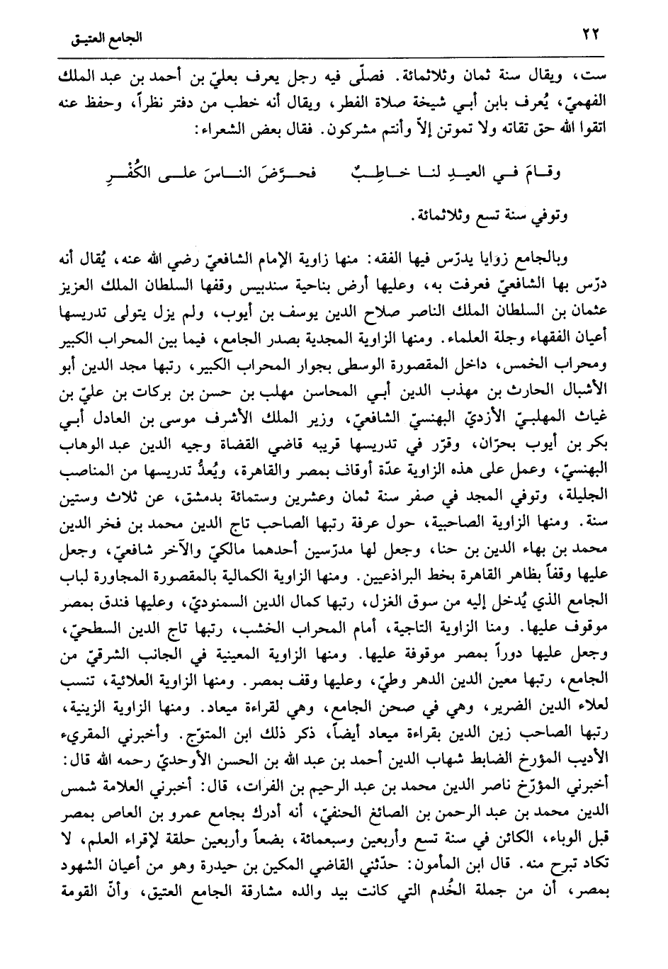 أخبرني المؤرّخ ناصر الدين محمد بن عبد الرحيم بن الفرات، قال: أخبرني العلامة شمس الدين محمد بن عبد الرحمن بن الصائغ الحنفيّ، أنه أدرك بجامع عمرو بن العاص بمصر قبل الوباء، الكائن في سنة تسع وأربعين وسبعمائة، بضعا وأربعين حلقة لإقراء العلم، لا تكاد تبرح منه. قال ابن المأمون: حدّثني القاضي المكين بن حيدرة وهو من أعيان الشهود بمصر، أن من جملة الخدم التي كانت بيد والده مشارقة الجامع العتيق، وأنّ القومة