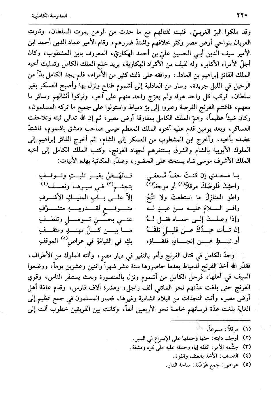 وقد ملكوا البرّ الغربيّ. فثبت لقتالهم مع ما حدث من الوهن بموت السلطان، وثارت العربان بنواحي أرض مصر وكثر خلافهم واشتدّ ضررهم، وقام الأمير عماد الدين أحمد ابن الأمير سيف الدين أبي الحسين عليّ بن أحمد الهكاريّ، المعروف بابن المشطوب، وكان أجلّ الأمراء الأكابر، وله لفيف من الأكراد الهكارية، يريد خلع الملك الكامل وتمليك أخيه الملك الفائز إبراهيم بن العادل، ووافقه على ذلك كثير من الأمراء، فلم يجد الكامل بدّا من الرحيل في الليل جريدة، وسار من العادلية إلى أشموم طناح ونزل بها وأصبح العسكر بغير سلطان، فركب كل واحد هواه ولم يعرّج واحد منهم على آخر، وتركوا أثقالهم وسائر ما معهم، فاغتنم الفرنج الفرصة وعبروا إلى برّ دمياط واستولوا على جميع ما تركه المسلمون، وكان شيئا عظيما، وهمّ الملك الكامل بمفارقة أرض مصر، ثم إن الله تعالى ثبته وتلاحقت العساكر، وبعد يومين قدم عليه أخوه الملك المعظم عيسى صاحب دمشق باشموم، فاشتدّ عضده بأخيه، وأخرج ابن المشطوب من العسكر إلى الشام، ثم أخرج الفائز إبراهيم إلى الملوك الأيوبية بالشام والشرق يستنفرهم لجهاد الفرنج، وكتب الملك الكامل إلى أخيه الملك الأشرف موسى شاه يستحثه على الحضور، وصدّر المكاتبة بهذه الأبيات: