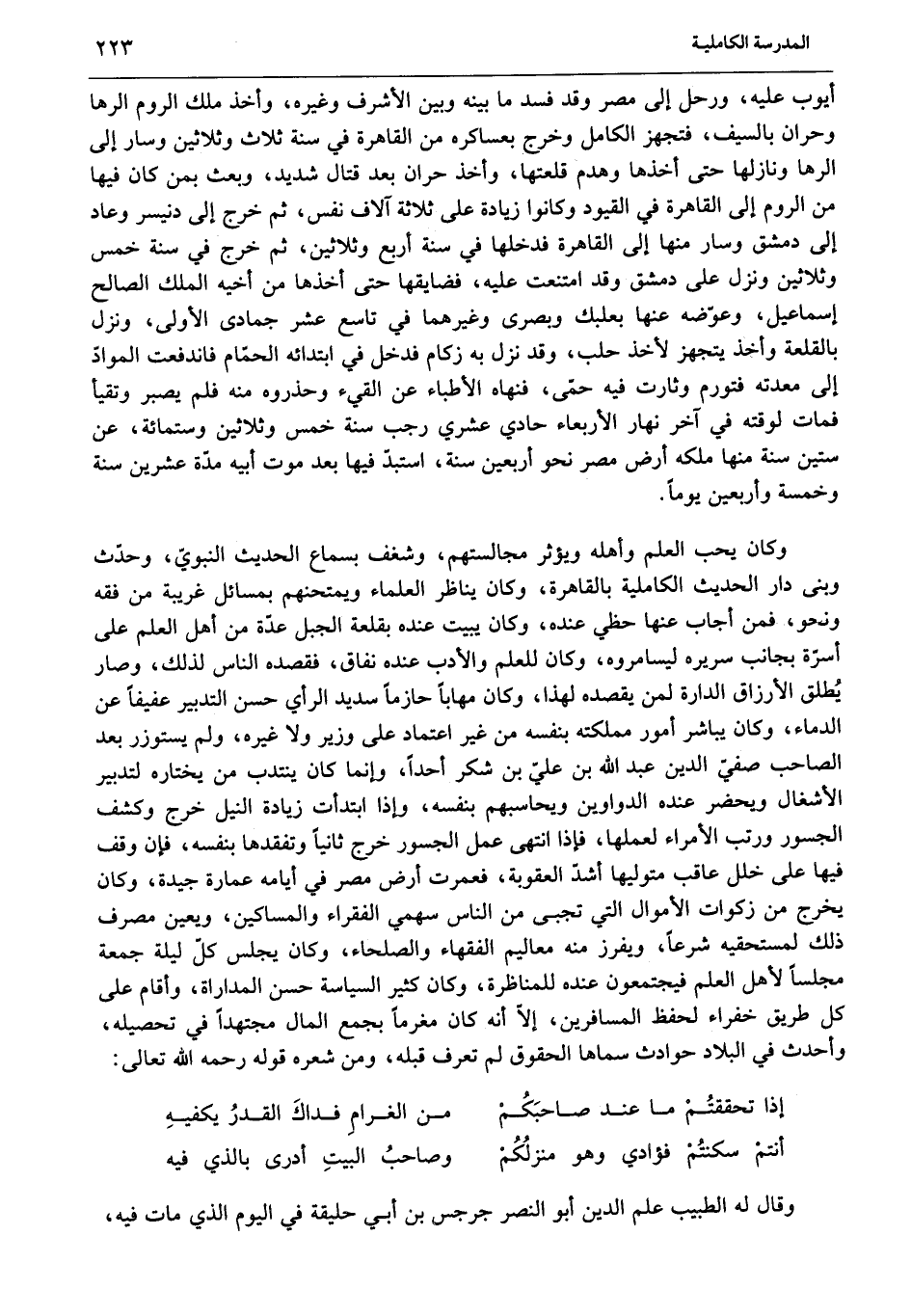 أيوب عليه، ورحل إلى مصر وقد فسد ما بينه وبين الأشرف وغيره، وأخذ ملك الروم الرها وحران بالسيف، فتجهز الكامل وخرج بعساكره من القاهرة في سنة ثلاث وثلاثين وسار إلى الرها ونازلها حتى أخذها وهدم قلعتها، وأخذ حران بعد قتال شديد، وبعث بمن كان فيها من الروم إلى القاهرة في القيود وكانوا زيادة على ثلاثة آلاف نفس، ثم خرج إلى دنيسر وعاد إلى دمشق وسار منها إلى القاهرة فدخلها في سنة أربع وثلاثين، ثم خرج في سنة خمس وثلاثين ونزل على دمشق وقد امتنعت عليه، فضايقها حتى أخذها من أخيه الملك الصالح إسماعيل، وعوّضه عنها بعلبك وبصرى وغيرهما في تاسع عشر جمادى الأولى، ونزل بالقلعة وأخذ يتجهز لأخذ حلب، وقد نزل به زكام فدخل في ابتدائه الحمّام فاندفعت الموادّ إلى معدته فتورم وثارت فيه حمّى، فنهاه الأطباء عن القيء وحذروه منه فلم يصبر وتقيأ فمات لوقته في آخر نهار الأربعاء حادي عشري رجب سنة خمس وثلاثين وستمائة، عن ستين سنة منها ملكه أرض مصر نحو أربعين سنة، استبدّ فيها بعد موت أبيه مدّة عشرين سنة وخمسة وأربعين يوما.