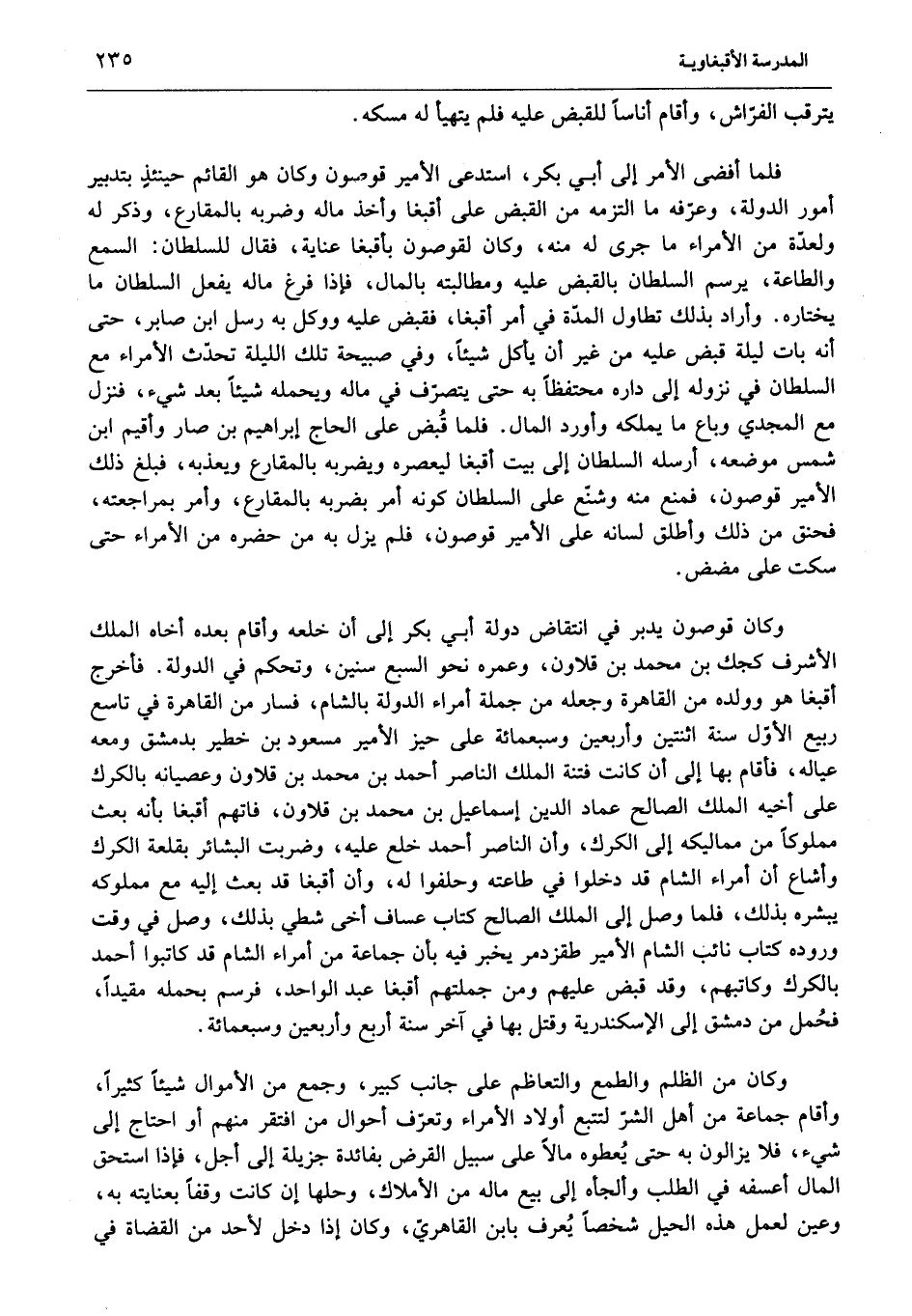 فلما أفضى الأمر إلى أبي بكر، استدعى الأمير قوصون وكان هو القائم حينئذ بتدبير أمور الدولة، وعرّفه ما التزمه من القبض على أقبغا وأخذ ماله وضربه بالمقارع، وذكر له ولعدّة من الأمراء ما جرى له منه، وكان لقوصون بأقبغا عناية، فقال للسلطان: السمع والطاعة، يرسم السلطان بالقبض عليه ومطالبته بالمال، فإذا فرغ ماله يفعل السلطان ما يختاره. وأراد بذلك تطاول المدّة في أمر أقبغا، فقبض عليه ووكل به رسل ابن صابر، حتى أنه بات ليلة قبض عليه من غير أن يأكل شيئا، وفي صبيحة تلك الليلة تحدّث الأمراء مع السلطان في نزوله إلى داره محتفظا به حتى يتصرّف في ماله ويحمله شيئا بعد شيء، فنزل مع المجدي وباع ما يملكه وأورد المال. فلما قبض على الحاج إبراهيم بن صار وأقيم ابن شمس موضعه، أرسله السلطان إلى بيت أقبغا ليعصره ويضربه بالمقارع ويعذبه، فبلغ ذلك الأمير قوصون، فمنع منه وشنّع على السلطان كونه أمر بضربه بالمقارع، وأمر بمراجعته، فحنق من ذلك وأطلق لسانه على الأمير قوصون، فلم يزل به من حضره من الأمراء حتى سكت على مضض.