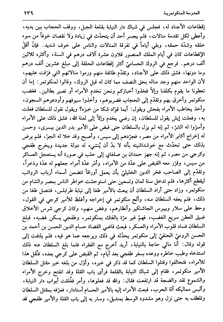 إقطاعات الأجناد له، فجلس في شباك دار النيابة بقلعة الجبل، ووقف الحجاب بين يديه، وأعطى لكل تقدمة منالات، فلم يجسر أحد أن يتحدّث في زيادة ولا نقصان خوفا من سوء خلقه وشدّة حمقه، وبقي أياما في تفرقة المنالات والناس على خوف شديد. فإنّ أقلّ الإقطاعات كان في أيام الملك المنصور قلاون عشرة آلاف درهم في السنة، وأكثره ثلاثين ألف درهم. فرجع في الروك الحساميّ أكثر إقطاعات الحلقة إلى مبلغ عشرين ألف درهم وما دونها، فشق ذلك على الأجناد، وتقدّم طائفة منهم ورموا منالاتهم التي فرّقت عليهم، لأن الواحد منهم وجد مناله بحق النصف مما كان له قبل الروك، وقالوا لمنكوتمر: إما أن تعطونا ما يقوم بكلفنا وإلّا فخذوا أخبازكم ونحن نخدم الأمراء أو نصير بطالين. فغضب منكوتمر وأخرق بهم وتقدّم إلى الحجاب فضربوهم، وأخذوا سيوفهم وأودعوهم السجون، وأخذ يخاطب الأمراء بفحش ويقول: أيما قوّاد شكا من خبزه؟ ويقول نقول للسلطان فعلت به، وفعلت إيش يقول للسلطان، إن رضي يخدم وإلّا إلى لعنة الله، فشق ذلك على الأمراء وأسرّوا له الشرّ، ثم إنه لم يزل بالسلطان حتى قبض على الأمير بدر الدين بيسرى، وحسن له إخراج أكابر الأمراء من مصر، فجرّدهم إلى سيس، وأصبح وقد خلا له الجوّ، فلم يرض بذلك حتى تحدّث مع خوشداشيته بأنه لا بدّ أن ينشئ له دولة جديدة ويخرج طفجي وكرجي من مصر، ثم إنه جهز حمدان بن صلغاي إلى حلب في صورة أنه يستعجل العساكر من سيس، وقرّر معه القبض على عدّة من الأمراء، وأمّر عدّة أمراء جعلهم له عدّة وذخرا، وتقدّم إلى الصاحب فخر الدين الخليليّ بأن يعمل أوراقا تتضمن أسماء أرباب الرواتب ليقطع أكثرها، فلم تدخل سنة ثمان وتسعين حتى استوحشت خواطر الناس بمصر والشام من منكوتمر، وزاد حتى أراد السلطان أن يبعث بالأمير طغا إلى نيابة طرابلس، فتنصل طغا من ذلك، فلم يعفه السلطان منه، وألح منكوتمر في إخراجه وأغلظ للأمير كرجي في القول، وحط على سلار وبيبرس الجاشنكير وأنظارهم، وغض منهم، وكان كرجي شرس الأخلاق ضيق العطن سريع الغضب، فهمّ غير مرّة بالفتك بمنكوتمر، وطفجي يسكن غضبه، فبلغ السلطان فساد قلوب الأمراء والعسكر، فبعث قاضي القضاة حسام الدين الحسن بن أحمد بن الحسن الروميّ الحنفيّ إلى منكوتمر يحدّثه في ذلك ويرجعه عما هو فيه، فلم يلتفت إلى قوله وقال: أنا مالي حاجة بالنيابة، أريد أخرج مع الفقراء فلما بلغ السلطان عنه ذلك استدعاه وطيب خاطره ووعده بسفر طفجي بعد أيام، ثم القبض على كرجي بعده، فنقل هذا للأمراء، فتحالفوا وقتلوا السلطان كما قد ذكر في خبره، وأوّل من بلغه خبر مقتل السلطان الأمير منكوتمر، فقام إلى شباك النيابة بالقلعة فرأى باب القلة وقد انفتح وخرج الأمراء والشموع تقد والضجة قد ارتفعت فقال: والله قد فعلوها، وأمر فغلقت أبواب دار النيابة، وألبس مماليكه آلة الحرب، فبعث الأمراء إليه بالأمير الحسام أستادار، فعرّفه بمقتل السلطان وتلطف به حتى نزل وهو مشدود الوسط بمنديل، وسار به إلى باب القلة والأمير طفجي قد
