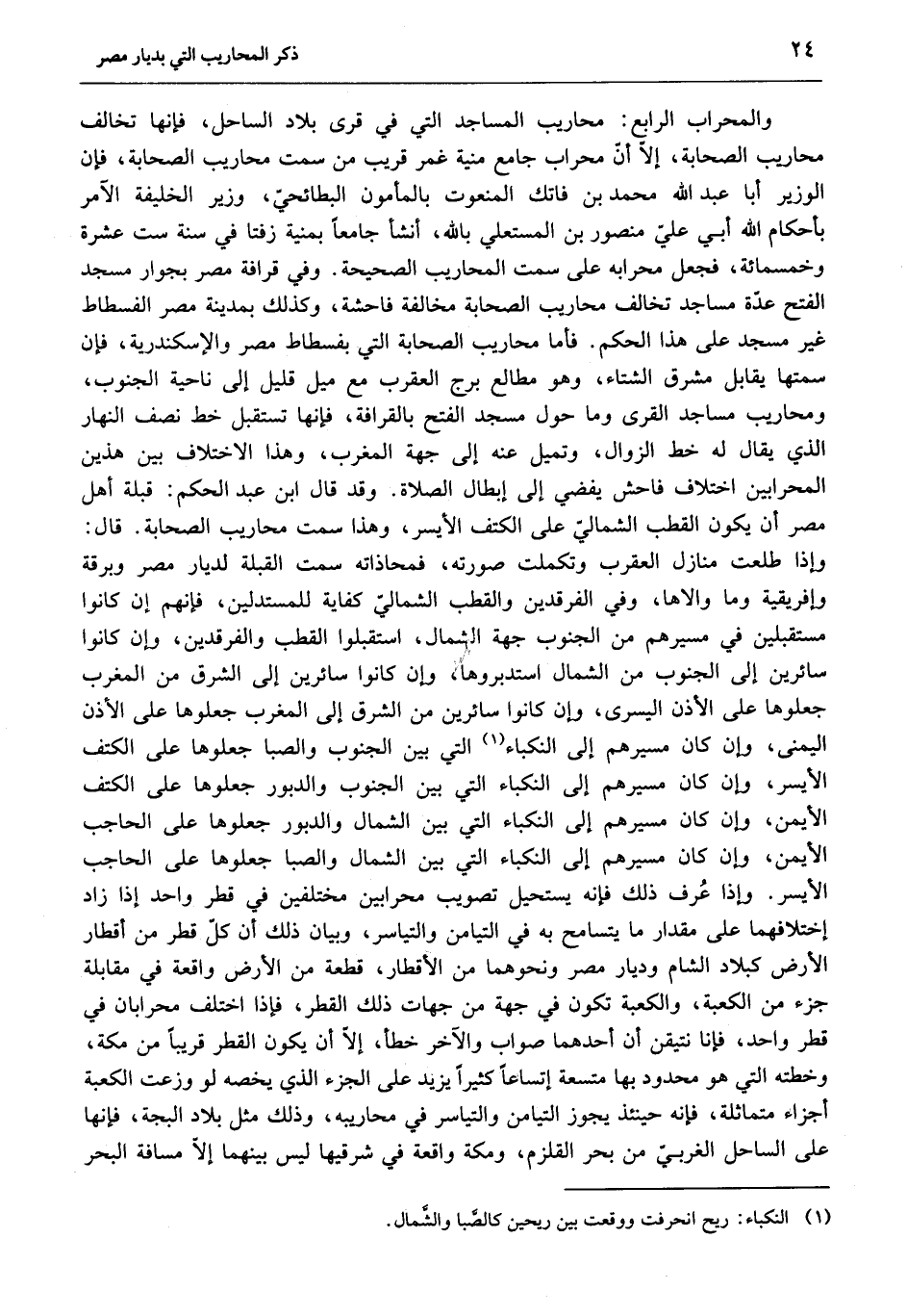 والمحراب الرابع: محاريب المساجد التي في قرى بلاد الساحل، فإنها تخالف محاريب الصحابة، إلّا أنّ محراب جامع منية غمر قريب من سمت محاريب الصحابة، فإن الوزير أبا عبد الله محمد بن فاتك المنعوت بالمأمون البطائحيّ، وزير الخليفة الآمر بأحكام الله أبي عليّ منصور بن المستعلي بالله، أنشأ جامعا بمنية زفتا في سنة ست عشرة وخمسمائة، فجعل محرابه على سمت المحاريب الصحيحة. وفي قرافة مصر بجوار مسجد الفتح عدّة مساجد تخالف محاريب الصحابة مخالفة فاحشة، وكذلك بمدينة مصر الفسطاط غير مسجد على هذا الحكم. فأما محاريب الصحابة التي بفسطاط مصر والإسكندرية، فإن سمتها يقابل مشرق الشتاء، وهو مطالع برج العقرب مع ميل قليل إلى ناحية الجنوب، ومحاريب مساجد القرى وما حول مسجد الفتح بالقرافة، فإنها تستقبل خط نصف النهار الذي يقال له خط الزوال، وتميل عنه إلى جهة المغرب، وهذا الاختلاف بين هذين المحرابين اختلاف فاحش يفضي إلى إبطال الصلاة. وقد قال ابن عبد الحكم: قبلة أهل مصر أن يكون القطب الشماليّ على الكتف الأيسر، وهذا سمت محاريب الصحابة. قال:
