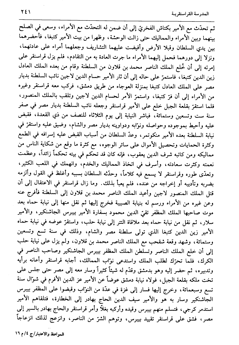 ثم تحدّث مع الأمير بكتاش الفخريّ إلى أن ضمن له التحدّث مع الأمراء، وسعى في الصلح بينهما وبين الأمراء والمماليك حتى زالت الوحشة، وظهرا من بيت الأمير كتبغا، فأحضرهما بين يدي السلطان وقبلا الأرض وأفيضت عليهما التشاريف وجعلهما أمراء على عادتهما، ونزلا إلى دورهما فحمل إليهما الأمراء ما جرت العادة به من التقادم، فلم يزل قراسنقر على إمرته إلى أن خلع الملك الناصر محمد بن قلاون من السلطنة وقام من بعده الملك العادل زين الدين كتبغا، فاستمرّ على حاله إلى أن ثار الأمير حسام الدين لاجين نائب السلطنة بديار مصر على الملك العادل كتبغا بمنزلة العوجاء من طريق دمشق، فركب معه قراسنقر وغيره من الأمراء إلى أن فرّ كتبغا، واستمرّ الأمر لحسام الدين لاجين وتلقب بالملك المنصور، فلما استقرّ بقلعة الجبل خلع على الأمير قراسنقر وجعله نائب السلطنة بديار مصر في صفر سنة ست وتسعين وستمائة، فباشر النيابة إلى يوم الثلاثاء للنصف من ذي القعدة، فقبض عليه وأحيط بموجوده وحواصله ونوّابه ودواوينه بديار مصر والشام، وضيق عليه واستقرّ في نيابة السلطنة بعده الأمير منكوتمر، وعدّ السلطان من أسباب القبض عليه إسرافه في الطمع وكثرة الحمايات وتحصيل الأموال على سائر الوجوه، مع كثرة ما وقع من شكاية الناس من مماليكه ومن كاتبه شرف الدين يعقوب، فإنه كان قد تحكم في بيته تحكما زائدا، وعظمت نعمته وكثرت سعادته، وأسرف في اتخاذ المماليك والخدم، وانهمك في اللعب الكثير، وتعدّى طوره وقراسنقر لا يسمع فيه كلاما، وحدّثه السلطان بسببه وأغلظ في القول وألزمه بضربه وتأديبه أو إخراجه من عنده، فلم يعبأ بذلك. وما زال قراسنقر في الاعتقال إلى أن قتل الملك المنصور لاجين وأعيد الملك الناصر محمد بن قلاون إلى السلطنة فأفرج عنه وعن غيره من الأمراء ورسم له بنيابة الصبيبة فخرج إليها ثم نقل منها إلى نيابة حماه بعد موت صاحبها الملك المظفر تقيّ الدين محمود بسفارة الأمير بيبرس الجاشنكير، والأمير سلار، ثم نقل من نيابة حماه بعد ملاقاة التتر إلى نيابة حلب، واستقرّ عوضه في نيابة حماه الأمير زين الدين كتبغا الذي تولى سلطنة مصر والشام، وذلك في سنة تسع وتسعين وستمائة، وشهد وقعة شقحب مع الملك الناصر محمد بن قلاون، ولم يزل على نيابة حلب إلى أن خلع الملك الناصر وتسلطن الملك المظفر بيبرس الجاشنكير وصاحب الناصر في الكرك، فلما تحرّك لطلب الملك واستدعى نوّاب الممالك، أجابه قراسنقر وأعانه برأيه وتدبيره، ثم حضر إليه وهو بدمشق وقدّم له شيئا كثيرا وسار معه إلى مصر حتى جلس على تخت ملكه بقلعة الجبل، فولاه نيابة دمشق عوضا عن الأمير عز الدين الأفرم في شوّال سنة تسع وسبعمائة، وخرج إليها فسار إلى غزة في عدّة من النوّاب وقبضوا على المظفر بيبرس الجاشنكير وسار به هو والأمير سيف الدين الحاج بهادر إلى الخطارة، فتلقاهم الأمير استدمر كرجي، فتسلم منهم بيبرس وقيده وأركبه بغلا وأمر قراسنقر والحاج بهادر بالسير إلى مصر، فشق على قراسنقر تقييد بيبرس، وتوهم الشرّ من الناصر، وانزعج لذلك انزعاجا