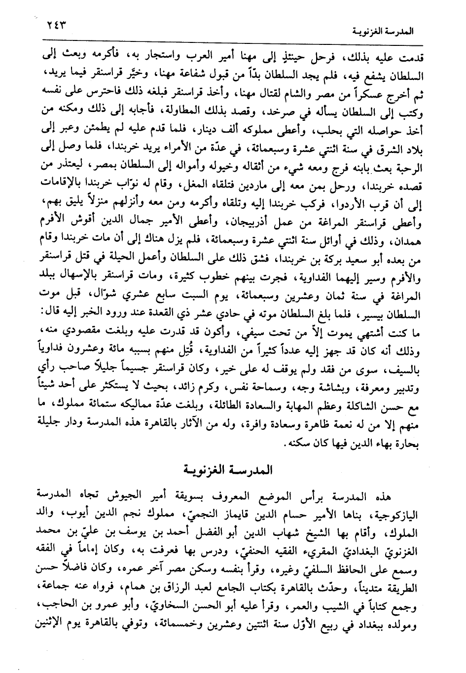 ما كنت أشتهي يموت إلّا من تحت سيفي، وأكون قد قدرت عليه وبلغت مقصودي منه، وذلك أنه كان قد جهز إليه عددا كثيرا من الفداوية، قتل منهم بسببه مائة وعشرون فداويا بالسيف، سوى من فقد ولم يوقف له على خير، وكان قراسنقر جسيما جليلا صاحب رأي وتدبير ومعرفة، وبشاشة وجه، وسماحة نفس، وكرم زائد، بحيث لا يستكثر على أحد شيئا مع حسن الشاكلة وعظم المهابة والسعادة الطائلة، وبلغت عدّة مماليكه ستمائة مملوك، ما منهم إلا من له نعمة ظاهرة وسعادة وافرة، وله من الآثار بالقاهرة هذه المدرسة ودار جليلة بحارة بهاء الدين فيها كان سكنه.