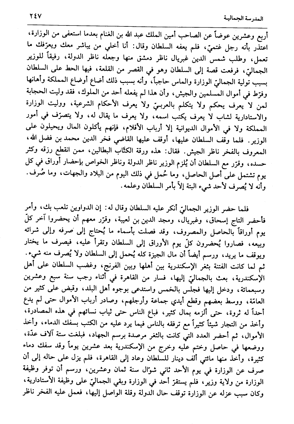 أربع وعشرين عوضا عن الصاحب أمين الملك عبد الله بن الغنام بعد ما استعفى من الوزارة، اعتذر بأنه رجل غتميّ، فلم يعفه السلطان وقال: أنا أخلي من يباشر معك ويعرّفك ما تعمل، وطلب شمس الدين غبريال ناظر دمشق منها وجعله ناظر الدولة، رفيقا للوزير الجماليّ، فرفعت قصة إلى السلطان وهو في القصر من القلعة، فيها الحط على السلطان بسبب تولية الجماليّ الوزارة والماس حاجبا، وأنه بسبب ذلك أضاع أوضاع المملكة وأهانها وفرّط في أموال المسلمين والجيش، وأن هذا لم يفعله أحد من الملوك، فقد وليت الحجابة لمن لا يعرف يحكم ولا يتكلم بالعربيّ ولا يعرف الإحكام الشرعية، ووليت الوزارة والاستادارية لشاب لا يعرف يكتب اسمه، ولا يعرف ما يقال له، ولا يتصرّف في أمور المملكة ولا في الأموال الديوانية إلا أرباب الأقلام، فإنهم يأكلون المال ويحيلون على الوزير. فلما وقف السلطان عليها، أوقف عليها القاضي فخر الدين محمد بن فضل الله، المعروف بالفخر ناظر الجيش. فقال: هذه ورقة الكتّاب البطالين، ممن انقطع رزقه وكثر حسده، وقرّر مع السلطان أن يلزم الوزير ناظر الدولة وناظر الخواص بإحضار أوراق في كل يوم تشتمل على أصل الحاصل، وما حمل في ذلك اليوم من البلاد والجهات، وما صرف.