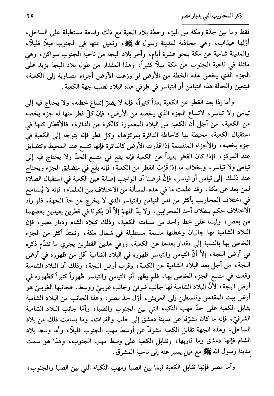 وأما إذا بعد القطر عن الكعبة بعدا كثيرا، فإنه لا يضرّ اتساع خطته، ولا يحتاج فيه إلى تيامن ولا تياسر، لاتساع الجزء الذي يخصه من الأرض، فإن كلّ قطر منها له جزء يخصه من الكعبة، من أجل أن الكعبة من البلاد المعمورة كالكرة من الدائرة، فالأقطار كلها في استقبال الكعبة، محيطة بها كاحاطة الدائرة بمركزها، وكل قطر فإنه يتوجه إلى الكعبة في جزء يخصه، والأجزاء المنقسمة إذا قدّرت الأرض كالدائرة فإنها تتسع عند المحيط وتتضايق عند المركز، فإذا كان القطر بعيدا عن الكعبة فإنه يقع في متسع الحدّ ولا يحتاج فيه إلى تيامن ولا تياسر، وبخلاف ما إذا قرب القطر من الكعبة، فإنه يقع في متضايق الجزء ويحتاج عند ذلك إلى تيامن أو تياسر، فإنّ فرضنا أن الواجب إصابة عين الكعبة في استقبال الصلاة لمن بعد عن مكة، وقد علمت ما في هذه المسألة من الاختلاف بين العلماء، فإنه لا يتسامح في اختلاف المحاريب بأكثر من قدر التيامن والتياسر الذي لا يخرج عن حدّ الجهة، فلو زاد الاختلاف حكم ببطلان أحد المحرابين، ولا بدّ اللهمّ إلّا أن يكونا في قطرين بعيدين بعضهما من بعض، وليسا على خط واحد من مسامته الكعبة، وذلك كبلاد الشام وديار مصر، فإن البلاد الشامية لها جانبان وخطتها متسعة مستطيلة في شمال مكة، وتمتدّ أكثر من الجزء الخاص بها بالنسبة إلى مقدار بعدها عن الكعبة، ووفي هذين القطرين يجري ما تقدّم ذكره في أرض البجة، إلّا أنّ التيامن والتياسر ظهوره في البلاد الشامية أقل من ظهوره في أرض البجة، من أجل بعد البلاد الشامية عن الكعبة، وقرب أرض البجة، وذلك أن البلاد الشامية وقعت في متسع الجزء الخاص بها، فلم يظهر أثر التيامن والتياسر ظهورا كثيرا كظهوره في أرض البجة، لأنّ البلاد الشامية لها جانب شرقيّ وجانب غربيّ ووسط، فجانبها الغربيّ هو أرض بيت المقدس وفلسطين إلى العريش، أوّل حدّ مصر، وهذا الجانب من البلاد الشامية يقابل الكعبة على حدّ مهب النكباء التي بين الجنوب والصبا، وأمّا جانب البلاد الشامية الشرقيّ، فإنه ما كان مشرّقا عن مدينة دمشق إلى حلب والفرات، وما يسامت ذلك من بلاد الساحل، وهذه الجهة تقابل الكعبة مشرقا عن أوسط مهب الجنوب قليلا، وأما وسط بلاد الشام فإنها دمشق وما قاربها، وتقابل الكعبة على وسط مهب الجنوب، وهذا هو سمت مدينة رسول الله صلّى الله عليه وسلّم مع ميل يسير عنه إلى ناحية المشرق.