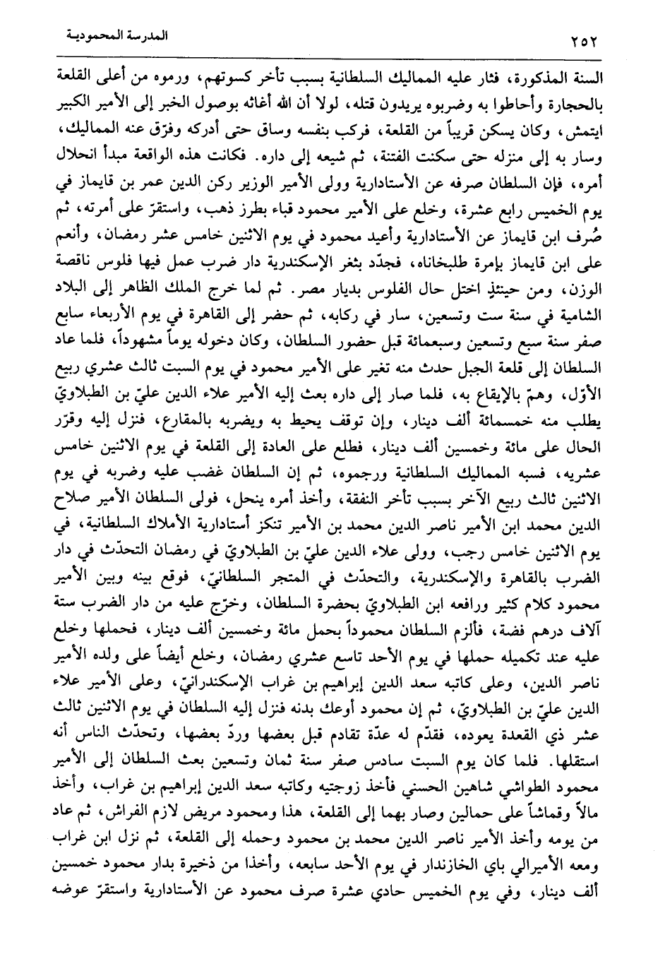 السنة المذكورة، فثار عليه المماليك السلطانية بسبب تأخر كسوتهم، ورموه من أعلى القلعة بالحجارة وأحاطوا به وضربوه يريدون قتله، لولا أن شاء الله أغاثه بوصول الخبر إلى الأمير الكبير ايتمش، وكان يسكن قريبا من القلعة، فركب بنفسه وساق حتى أدركه وفرّق عنه المماليك، وسار به إلى منزله حتى سكنت الفتنة، ثم شيعه إلى داره. فكانت هذه الواقعة مبدأ انحلال أمره، فإن السلطان صرفه عن الأستادارية وولى الأمير الوزير ركن الدين عمر بن قايماز في يوم الخميس رابع عشرة، وخلع على الأمير محمود قباء بطرز ذهب، واستقرّ على أمرته، ثم صرف ابن قايماز عن الأستادارية وأعيد محمود في يوم الاثنين خامس عشر رمضان، وأنعم على ابن قايماز بإمرة طلبخاناه، فجدّد بثغر الإسكندرية دار ضرب عمل فيها فلوس ناقصة الوزن، ومن حينئذ اختل حال الفلوس بديار مصر. ثم لما خرج الملك الظاهر إلى البلاد الشامية في سنة ست وتسعين، سار في ركابه، ثم حضر إلى القاهرة في يوم الأربعاء سابع صفر سنة سبع وتسعين وسبعمائة قبل حضور السلطان، وكان دخوله يوما مشهودا، فلما عاد السلطان إلى قلعة الجبل حدث منه تغير على الأمير محمود في يوم السبت ثالث عشري ربيع الأوّل، وهمّ بالإيقاع به، فلما صار إلى داره بعث إليه الأمير علاء الدين عليّ بن الطبلاويّ يطلب منه خمسمائة ألف دينار، وإن توقف يحيط به ويضربه بالمقارع، فنزل إليه وقرّر الحال على مائة وخمسين ألف دينار، فطلع على العادة إلى القلعة في يوم الاثنين خامس عشريه، فسبه المماليك السلطانية ورجموه، ثم إن السلطان غضب عليه وضربه في يوم الاثنين ثالث ربيع الآخر بسبب تأخر النفقة، وأخذ أمره ينحل، فولى السلطان الأمير صلاح الدين محمد ابن الأمير ناصر الدين محمد بن الأمير تنكز أستادارية الأملاك السلطانية، في يوم الاثنين خامس رجب، وولى علاء الدين عليّ بن الطبلاويّ في رمضان التحدّث في دار الضرب بالقاهرة والإسكندرية، والتحدّث في المتجر السلطانيّ، فوقع بينه وبين الأمير محمود كلام كثير ورافعه ابن الطبلاويّ بحضرة السلطان، وخرّج عليه من دار الضرب ستة آلاف درهم فضة، فألزم السلطان محمودا بحمل مائة وخمسين ألف دينار، فحملها وخلع عليه عند تكميله حملها في يوم الأحد تاسع عشري رمضان، وخلع أيضا على ولده الأمير ناصر الدين، وعلى كاتبه سعد الدين إبراهيم بن غراب الإسكندرانيّ، وعلى الأمير علاء الدين عليّ بن الطبلاويّ، ثم إن محمود أوعك بدنه فنزل إليه السلطان في يوم الاثنين ثالث عشر ذي القعدة يعوده، فقدّم له عدّة تقادم قبل بعضها وردّ بعضها، وتحدّث الناس أنه استقلها. فلما كان يوم السبت سادس صفر سنة ثمان وتسعين بعث السلطان إلى الأمير محمود الطواشي شاهين الحسني فأخذ زوجتيه وكاتبه سعد الدين إبراهيم بن غراب، وأخذ مالا وقماشا على حمالين وصار بهما إلى القلعة، هذا ومحمود مريض لازم الفراش، ثم عاد من يومه وأخذ الأمير ناصر الدين محمد بن محمود وحمله إلى القلعة، ثم نزل ابن غراب ومعه الأمير الي باي الخازندار في يوم الأحد سابعه، وأخذا من ذخيرة بدار محمود خمسين ألف دينار، وفي يوم الخميس حادي عشرة صرف محمود عن الأستادارية واستقرّ عوضه