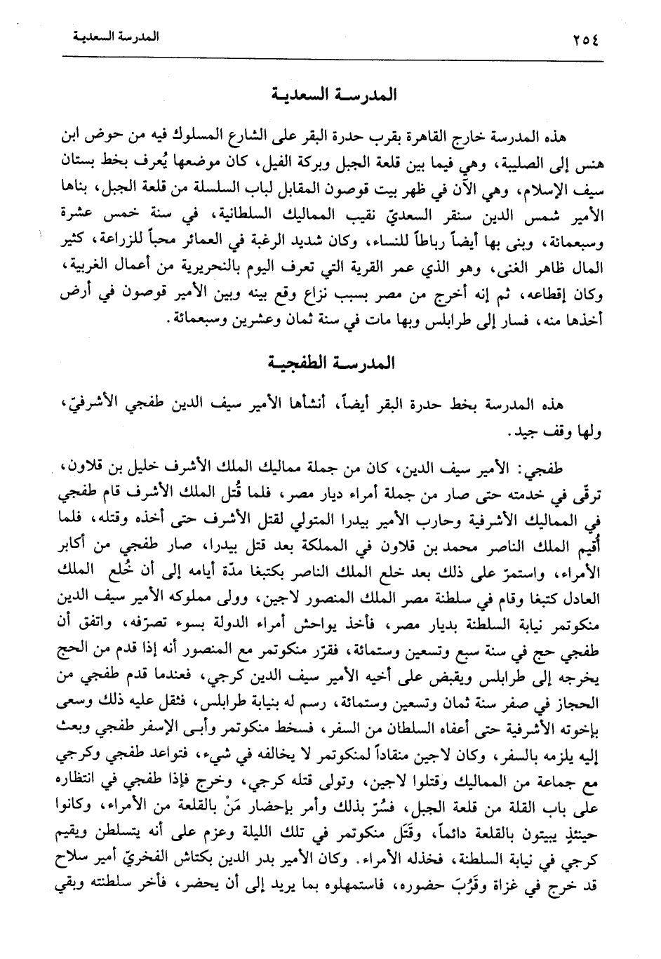 طفجي: الأمير سيف الدين، كان من جملة مماليك الملك الأشرف خليل بن قلاون، ترقّى في خدمته حتى صار من جملة أمراء ديار مصر، فلما قتل الملك الأشرف قام طفجي في المماليك الأشرفية وحارب الأمير بيدرا المتولي لقتل الأشرف حتى أخذه وقتله، فلما أقيم الملك الناصر محمد بن قلاون في المملكة بعد قتل بيدرا، صار طفجي من أكابر الأمراء، واستمرّ على ذلك بعد خلع الملك الناصر بكتبغا مدّة أيامه إلى أن خلع الملك العادل كتبغا وقام في سلطنة مصر الملك المنصور لاجين، وولى مملوكه الأمير سيف الدين منكوتمر نيابة السلطنة بديار مصر، فأخذ يواحش أمراء الدولة بسوء تصرّفه، واتفق أن طفجي حج في سنة سبع وتسعين وستمائة، فقرّر منكوتمر مع المنصور أنه إذا قدم من الحج يخرجه إلى طرابلس ويقبض على أخيه الأمير سيف الدين كرجي، فعندما قدم طفجي من الحجاز في صفر سنة ثمان وتسعين وستمائة، رسم له بنيابة طرابلس، فثقل عليه ذلك وسعى بإخوته الأشرفية حتى أعفاه السلطان من السفر، فسخط منكوتمر وأبى الإسفر طفجي وبعث إليه يلزمه بالسفر، وكان لاجين منقادا لمنكوتمر لا يخالفه في شيء، فتواعد طفجي وكرجي مع جماعة من المماليك وقتلوا لاجين، وتولى قتله كرجي، وخرج فإذا طفجي في انتظاره على باب القلة من قلعة الجبل، فسرّ بذلك وأمر بإحضار من بالقلعة من الأمراء، وكانوا حينئذ يبيتون بالقلعة دائما، وقتل منكوتمر في تلك الليلة وعزم على أنه يتسلطن ويقيم كرجي في نيابة السلطنة، فخذله الأمراء. وكان الأمير بدر الدين بكتاش الفخريّ أمير سلاح قد خرج في غزاة وقرب حضوره، فاستمهلوه بما يريد إلى أن يحضر، فأخر سلطنته وبقي