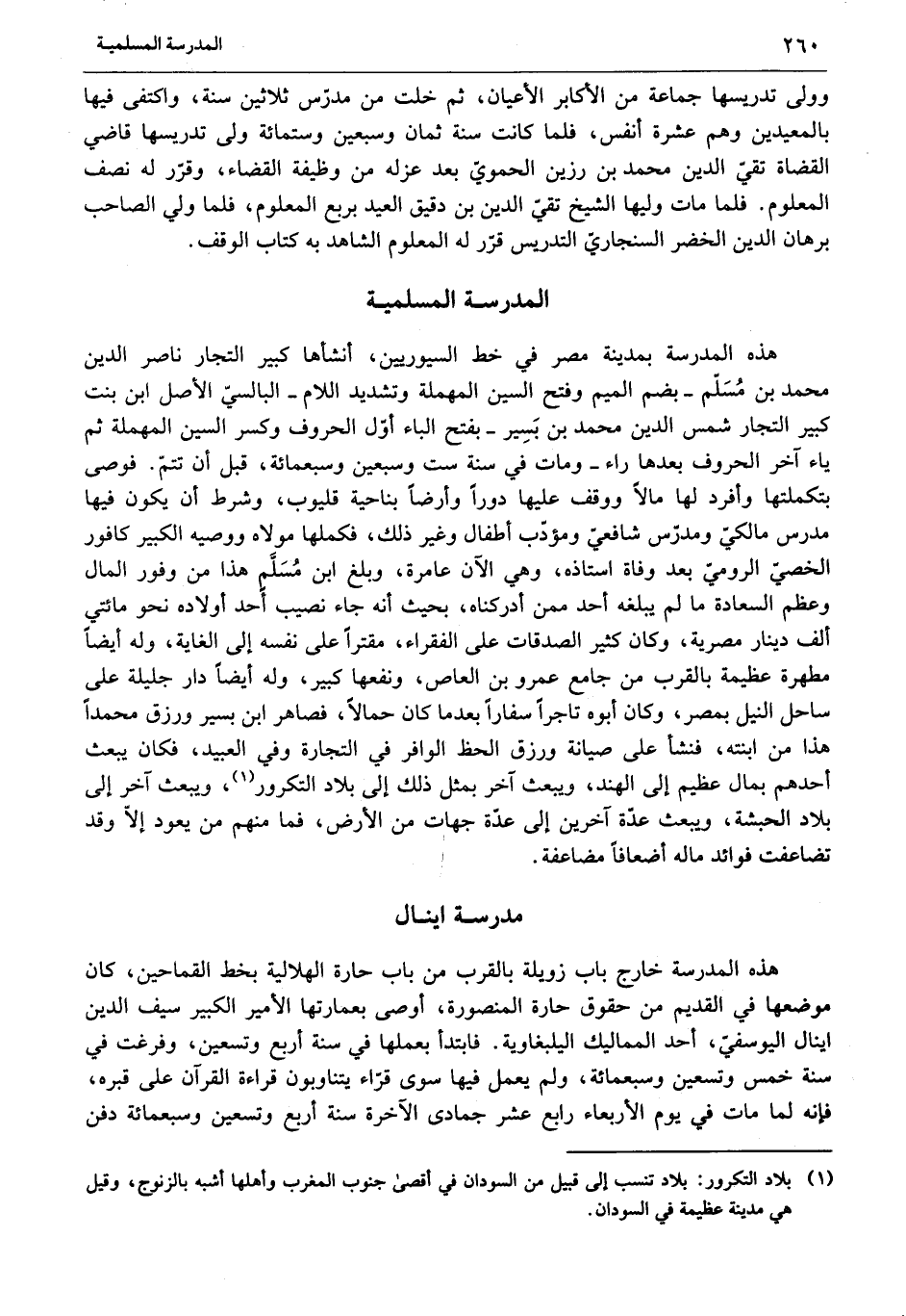 هذه المدرسة بمدينة مصر في خط السيوريين، أنشأها كبير التجار ناصر الدين محمد بن مسلّم- بضم الميم وفتح السين المهملة وتشديد اللام- البالسيّ الأصل ابن بنت كبير التجار شمس الدين محمد بن بسير- بفتح الباء أوّل الحروف وكسر السين المهملة ثم ياء آخر الحروف بعدها راء- ومات في سنة ست وسبعين وسبعمائة، قبل أن تتمّ. فوصى بتكملتها وأفرد لها مالا ووقف عليها دورا وأرضا بناحية قليوب، وشرط أن يكون فيها مدرس مالكيّ ومدرّس شافعيّ ومؤدّب أطفال وغير ذلك، فكملها مولاه ووصيه الكبير كافور الخصيّ الروميّ بعد وفاة استاذه، وهي الآن عامرة، وبلغ ابن مسلَّم هذا من وفور المال وعظم السعادة ما لم يبلغه أحد ممن أدركناه، بحيث أنه جاء نصيب أحد أولاده نحو مائتي ألف دينار مصرية، وكان كثير الصدقات على الفقراء، مقترا على نفسه إلى الغاية، وله أيضا مطهرة عظيمة بالقرب من جامع عمرو بن العاص، ونفعها كبير، وله أيضا دار جليلة على ساحل النيل بمصر، وكان أبوه تاجرا سفارا بعد ما كان حمالا، فصاهر ابن بسير ورزق محمدا هذا من ابنته، فنشأ على صيانة ورزق الحظ الوافر في التجارة وفي العبيد، فكان يبعث أحدهم بمال عظيم إلى الهند، ويبعث آخر بمثل ذلك إلى بلاد التكرور «1» ، ويبعث آخر إلى بلاد الحبشة، ويبعث عدّة آخرين إلى عدّة جهات من الأرض، فما منهم من يعود إلّا وقد تضاعفت فوائد ماله أضعافا مضاعفة.