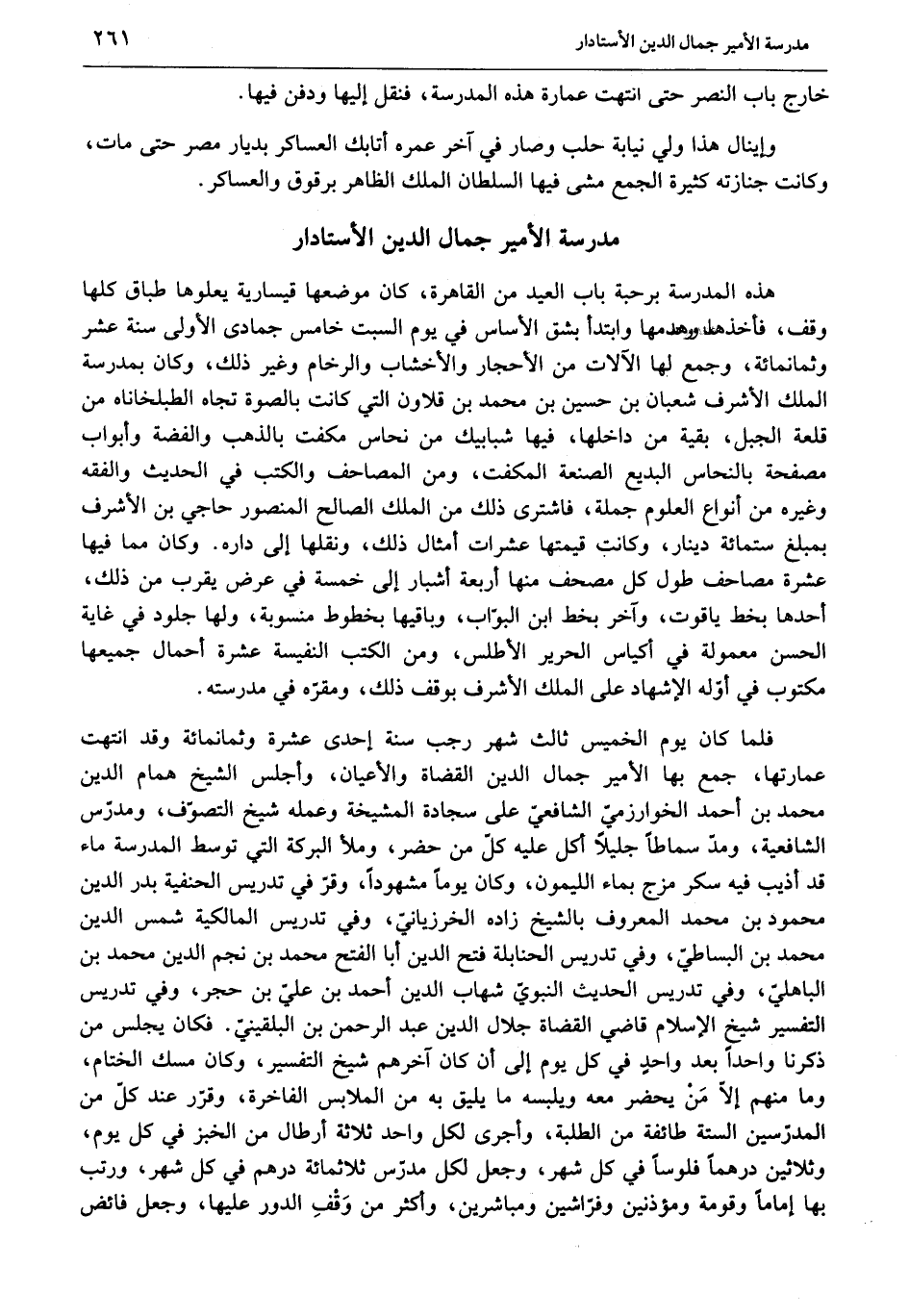 فلما كان يوم الخميس ثالث شهر رجب سنة إحدى عشرة وثمانمائة وقد انتهت عمارتها، جمع بها الأمير جمال الدين القضاة والأعيان، وأجلس الشيخ همام الدين محمد بن أحمد الخوارزميّ الشافعيّ على سجادة المشيخة وعمله شيخ التصوّف، ومدرّس الشافعية، ومدّ سماطا جليلا أكل عليه كلّ من حضر، وملأ البركة التي توسط المدرسة ماء قد أذيب فيه سكر مزج بماء الليمون، وكان يوما مشهودا، وقرّ في تدريس الحنفية بدر الدين محمود بن محمد المعروف بالشيخ زاده الخرزيانيّ، وفي تدريس المالكية شمس الدين محمد بن البساطيّ، وفي تدريس الحنابلة فتح الدين أبا الفتح محمد بن نجم الدين محمد بن الباهليّ، وفي تدريس الحديث النبويّ شهاب الدين أحمد بن عليّ بن حجر، وفي تدريس التفسير شيخ الإسلام قاضي القضاة جلال الدين عبد الرحمن بن البلقينيّ. فكان يجلس من ذكرنا واحدا بعد واحد في كل يوم إلى أن كان آخرهم شيخ التفسير، وكان مسك الختام، وما منهم إلّا من يحضر معه ويلبسه ما يليق به من الملابس الفاخرة، وقرّر عند كلّ من المدرّسين الستة طائفة من الطلبة، وأجرى لكل واحد ثلاثة أرطال من الخبز في كل يوم، وثلاثين درهما فلوسا في كل شهر، وجعل لكل مدرّس ثلاثمائة درهم في كل شهر، ورتب بها إماما وقومة ومؤذنين وفرّاشين ومباشرين، وأكثر من وقف الدور عليها، وجعل فائض